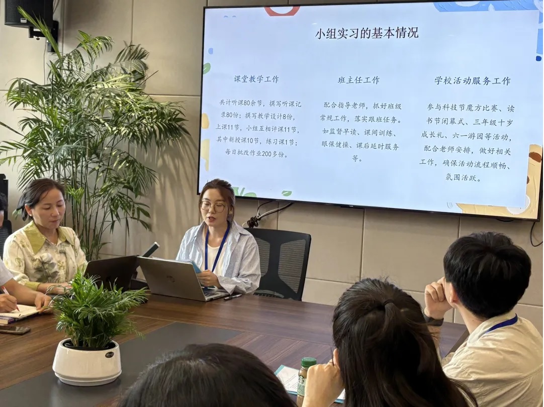 与文海凌云小学共同举行本次实习总结分享会。文海凌云小学刘芳赟校长、朱伟良副校长、各科室负责人及实习生的指导教师与成人在线