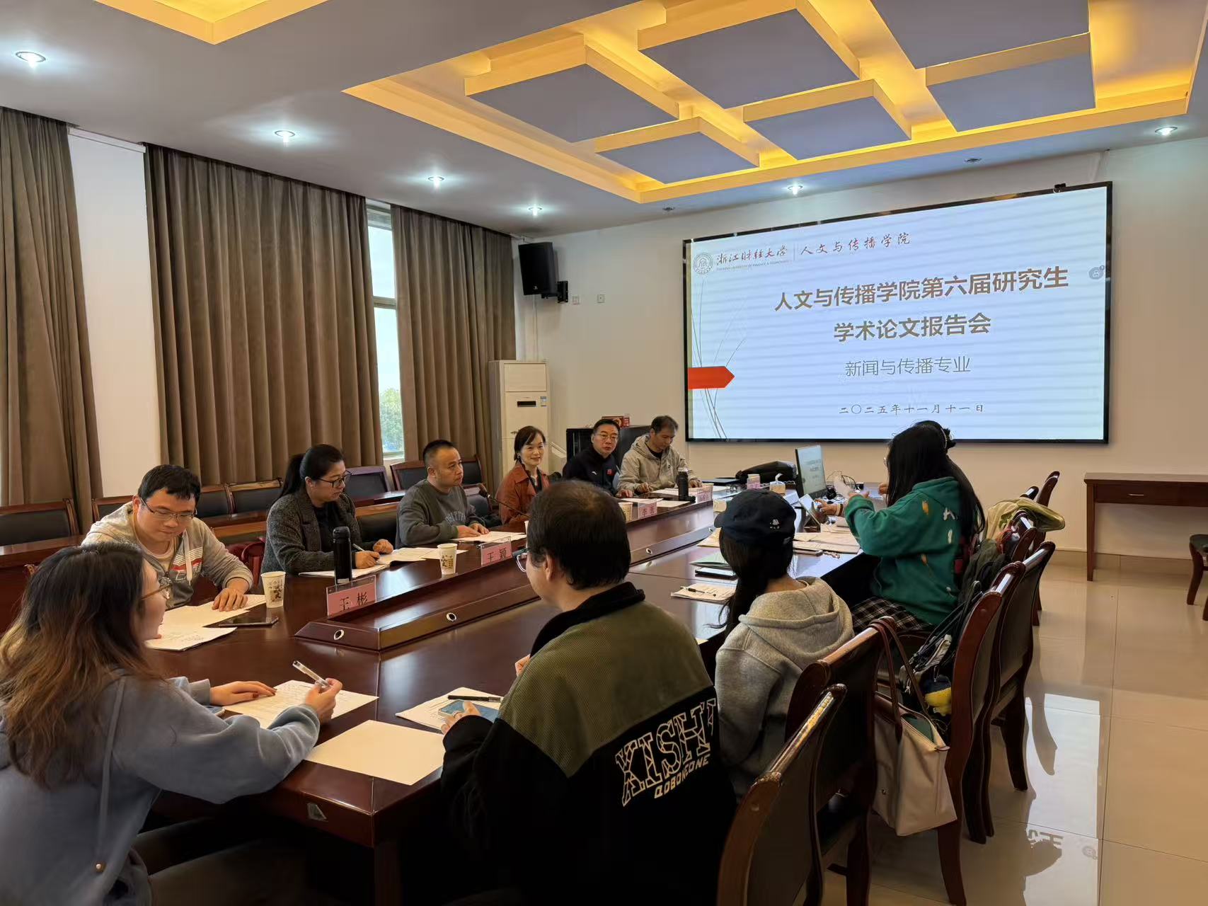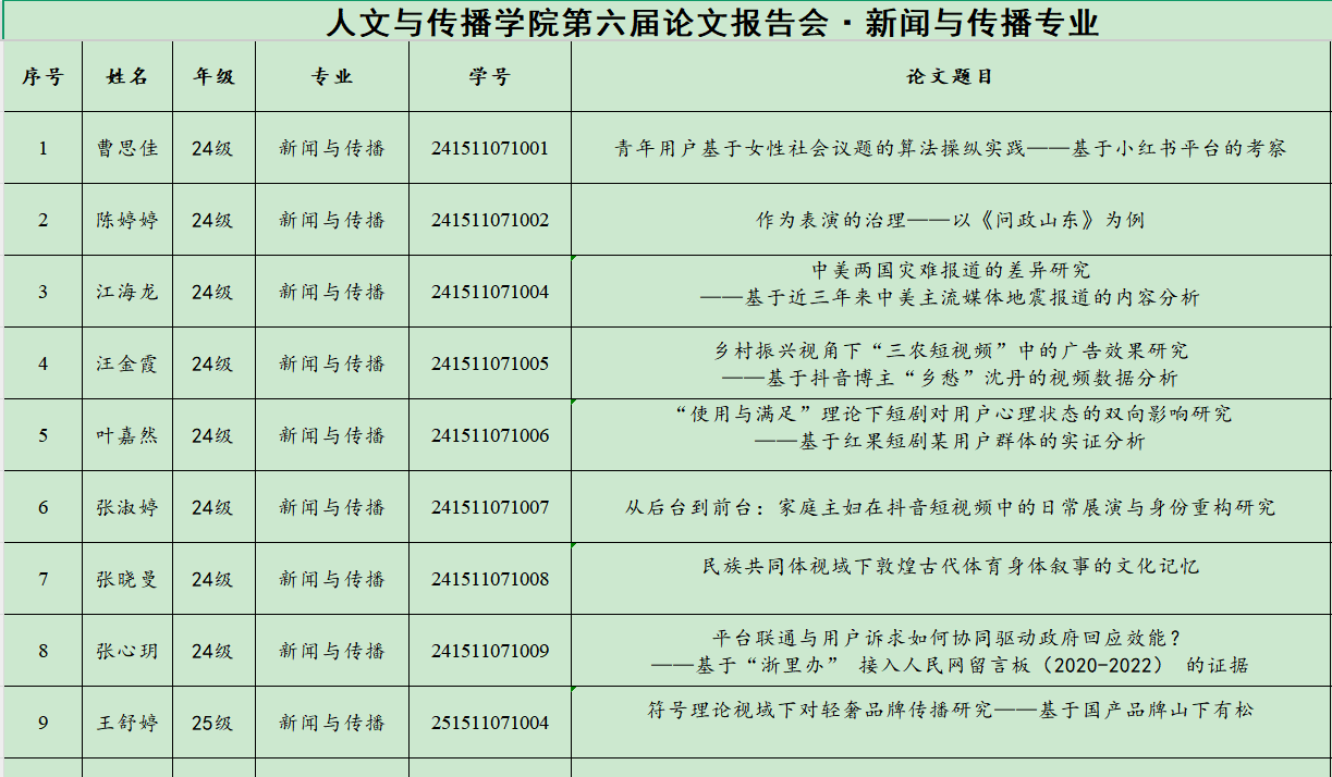 11月11日,新闻与传播专业硕士研究生学术论文报告会顺利举行,共有9位研究生参加本次论文报告会。为进一步提高研究生学术论文写作能力,特邀请浙江工商大学李蓉教授作为校外专家评委参加本次论文报告会。担任评委的还有喻发胜教授、陆斌副教授、胡文财副教授、王颖副教授、王彬博士。研究生提交学术论文情况如下: