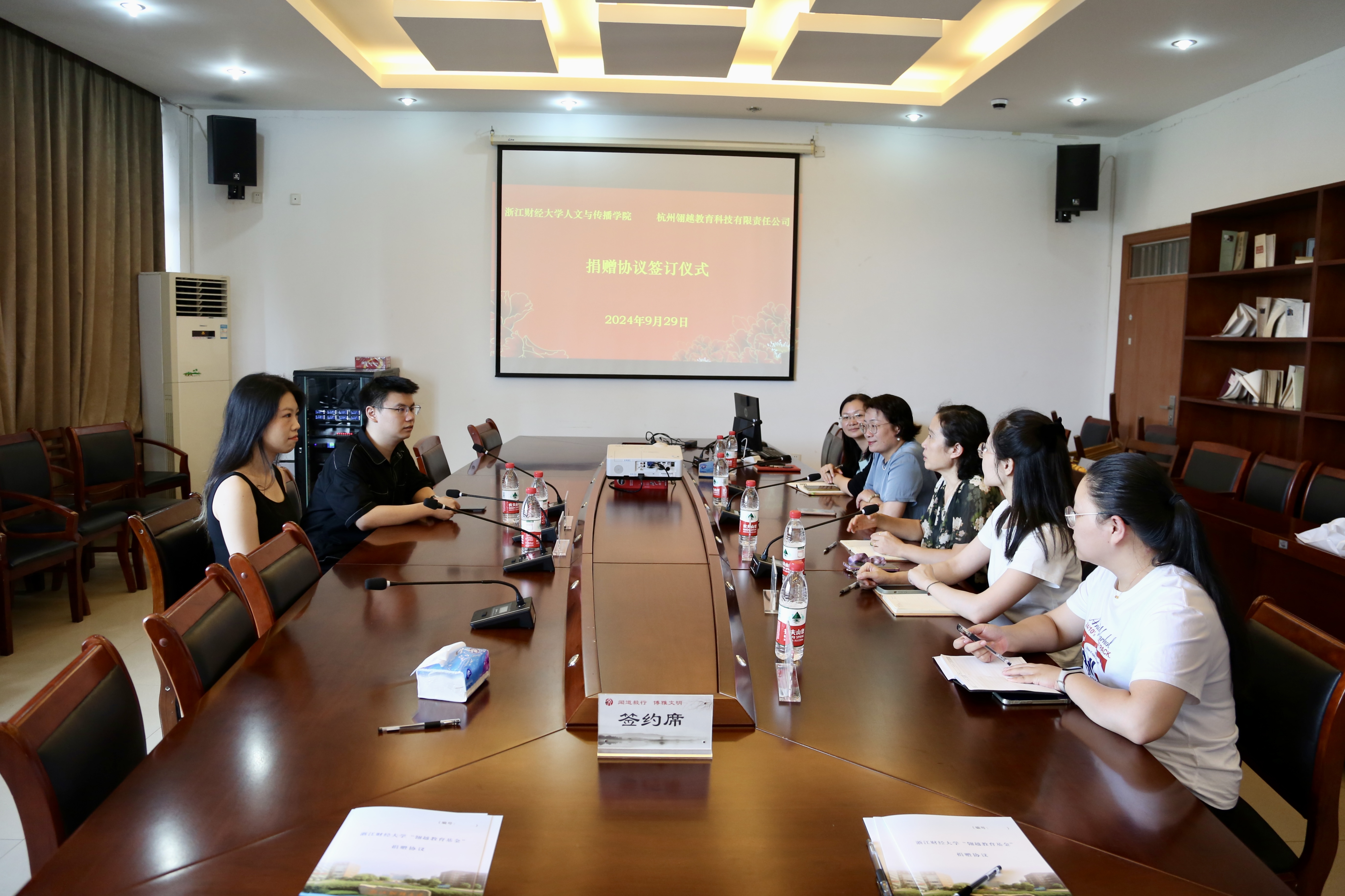 404会议室举行。学院党委书记罗金艳、副书记袁慧兰、校友办副主任韦晓蓓、杭州翎越教育科技有限责任公司总经理胡嘉奇、主任徐婷婷等共同出席签约仪式。