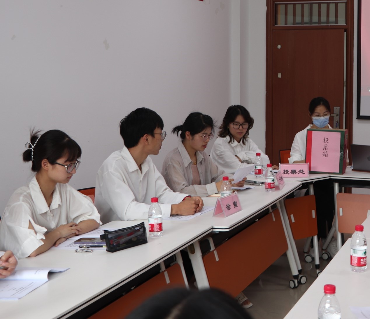 委员会委员和主席团成员选举,总监票人刘华婷老师全程核实,各研究生代表填写投票,计票人统计各候选人选票,最终由刘华婷老师宣布计票结果,选举卢慧珊、杨佳慧为成人在线