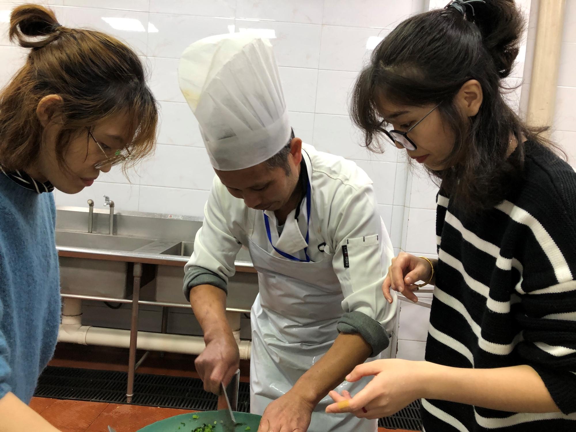 19日上午,负责采买的同学一大早去超市选购包饺子所用食材,在食堂经理与主厨的指导帮助下,同学们分工合作,洗菜、切菜、调馅,大家热情高涨、气氛活跃,围在一起包饺子、煮汤圆。当一盘盘热饺和汤圆上桌的时候, 同学们脸上都洋溢着幸福的笑容。