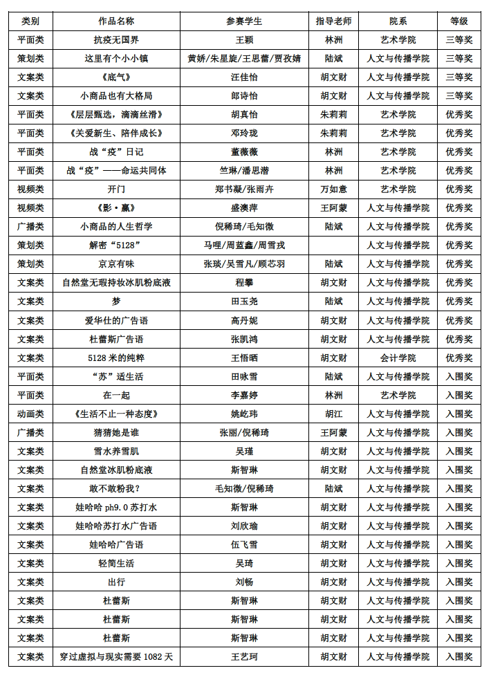 近日,浙江省第八届大学生广告创意设计竞赛(简称“省赛”)作品评审揭晓,共选拔62所高校702件作品参加全国大学生广告艺术大赛(简称“国赛”),其中我校共34件作品获得省赛奖项,并获报参加国赛资格。此次省赛获奖作品中,我校共获得三等奖4项,优秀奖14项,入围奖16项。