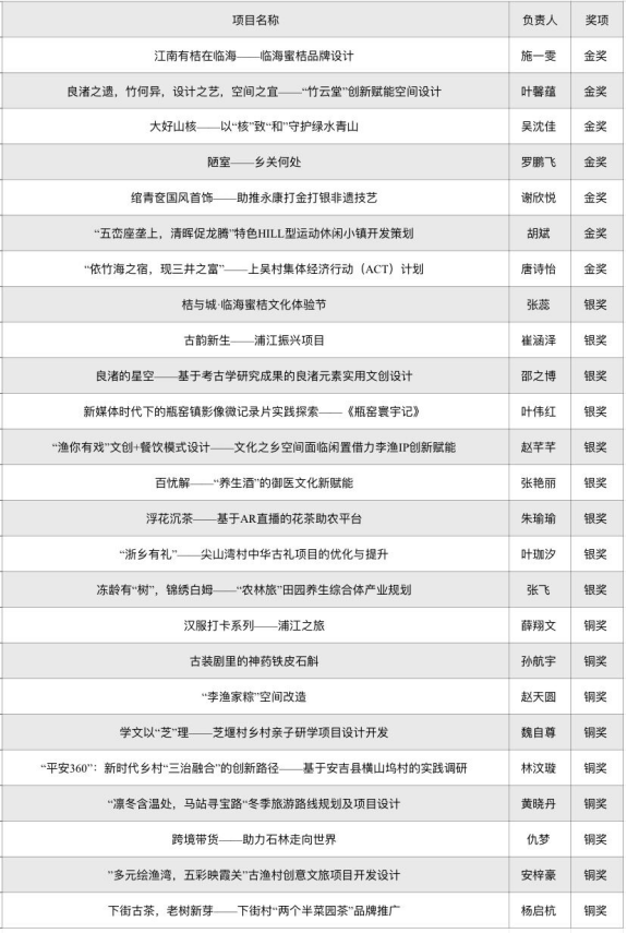 “农信杯”第三届浙江省大学生乡村振兴创意大赛为省级A类学科竞赛,本届大赛省内外85所高校参赛,共有1221个团队,15000余名师生参加,共评出金奖82项,银奖158项,铜奖191项。相比以往,今年的大赛更进一步强调了创新和落地,兰溪文化赋能空间专项赛、首届长三角大学生良渚文化创意专项赛、浦江·首届中国乡村直播专项赛、临海“金名片”文化创意专项赛等四个专项赛为当地乡村量身定做乡村振兴方案,坚持真题真做,深受当地政府和群众欢迎。