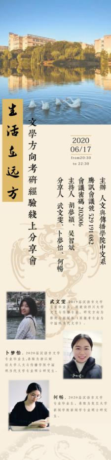 6月7日晚,在中文系副主任胡梦颖老师组织下,“生活在远方”文学方向考研经验线上分享会以腾讯会议形式进行,本场分享会由胡梦颖老师、吴智斌老师主持,邀请到成人在线