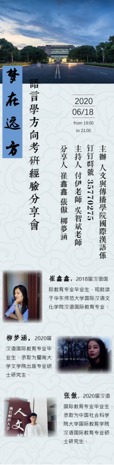 “梦在远方”语言学方向考研经验分享会于6月18日晚成功举行,本场分享会由国际汉语系主任付伊老师组织并由铁徽老师主持,邀请到成人在线