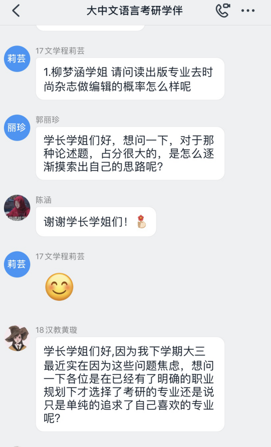 18届汉语国际教育专业毕业生崔鑫鑫和20届汉语国际教育专业毕业生柳梦涵、张傲同学参与分享。在会上,学长学姐们根据个人情况围绕着择校标准、备考建议和备考心态这些方面,向大家分享了自己是如何确定目标院校,怎样规划备考时间,怎样克服备考困难的心路历程,并一一解答同学们的提问。