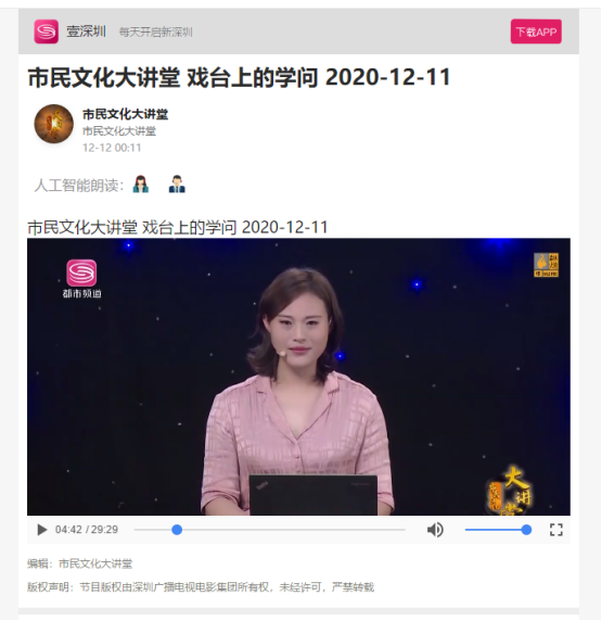 2020年10月25日,成人在线 毋丹老师受深圳市委宣传部、深圳市社科联联合邀请,作客深圳市民文化大讲堂,开展了一场题为“戏台上的学问和学问中的戏台”的精彩讲座,反响热烈。由该场讲座剪辑制作的电视节目于12月11日在深圳市民频道播出。