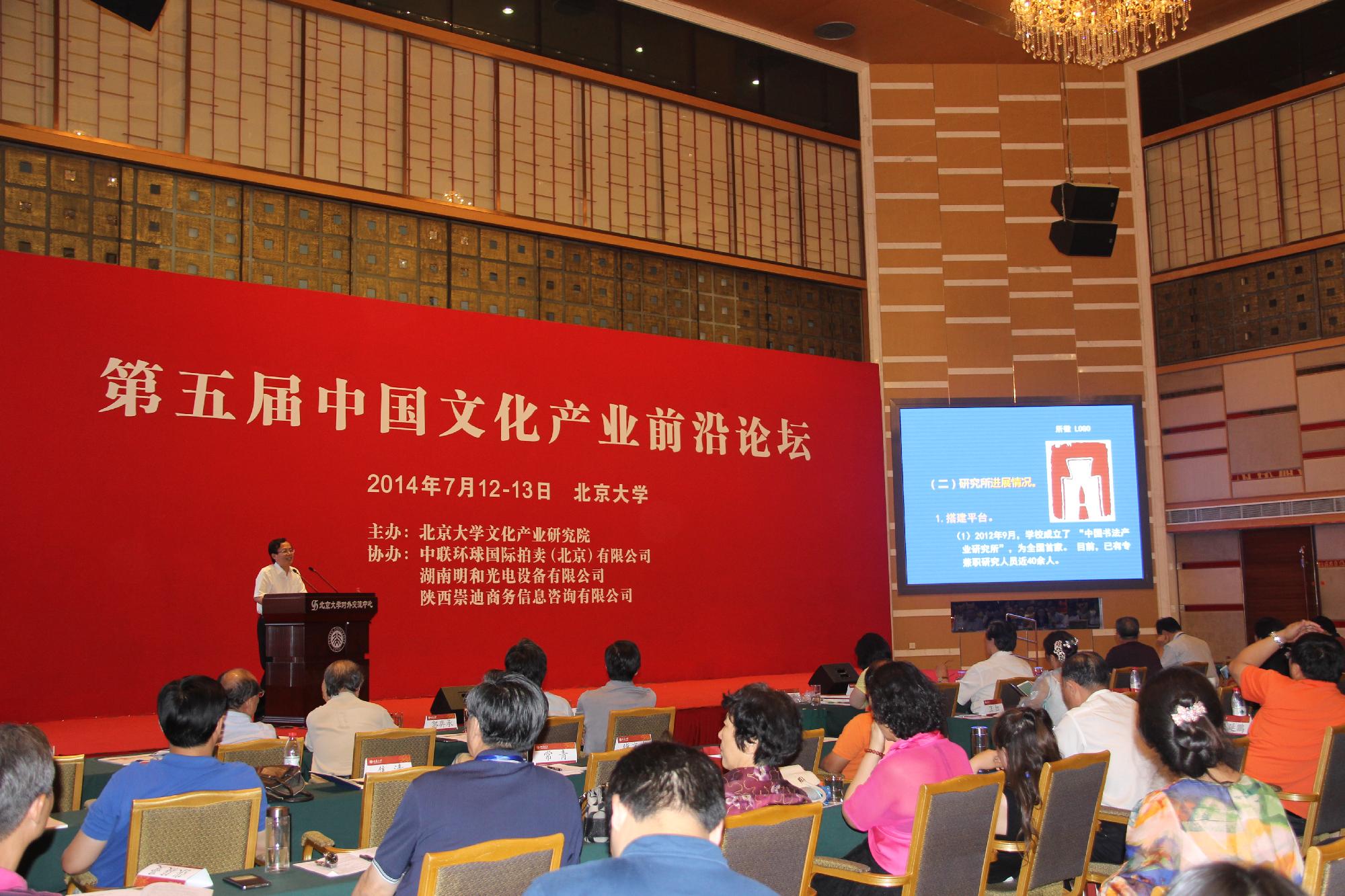 7月12日至13日,由北京大学主办的第五届中国文化产业前沿论坛暨中国书画五十人论坛在北京举行。我校副校长、中国书法产业研究所所长黄建新应邀出席和担任论坛副主席,并作了题为《书法产业研究与美丽乡村的建设与实践》的主旨演讲。来自中央与地方的政府领导,中国(含港澳台)、英国、韩国等国家和地区的专家学者以及文化产业界各领域的企业精英、媒体朋友500余名齐聚燕园,共享文化产业盛事。