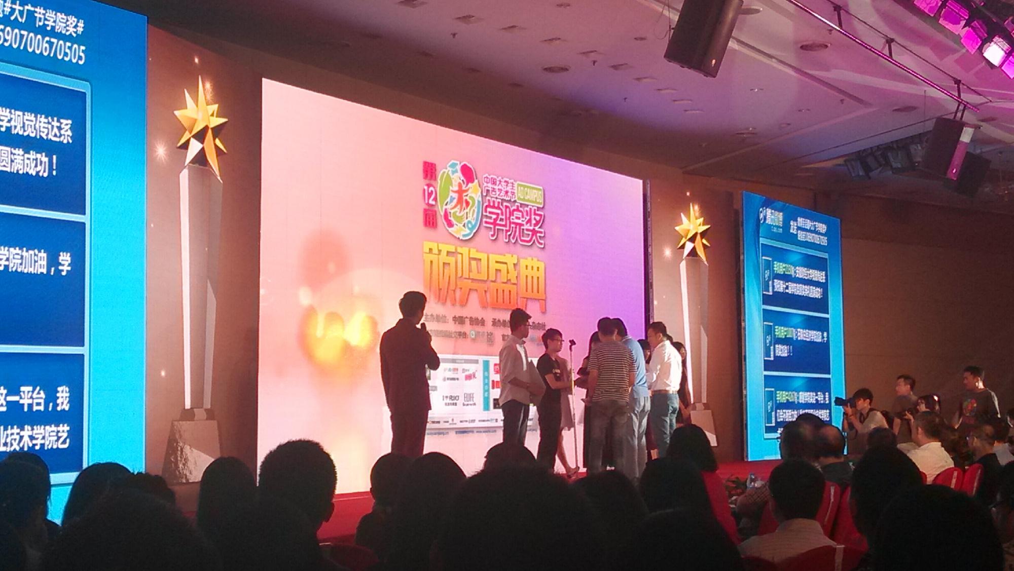 2014年7月18日,由中国广告协会主办,《广告人》杂志承办的“第十二届中国大学生广告艺术节学院奖”颁奖盛典在北京梅地亚中心盛大举行。由我学院教师王阿蒙指导,数字媒体艺术系11级学生陈珈萱、胡玥聪、刘静洁、黄琳淇等创作的广告作品《释放自我、追求真我》获得了综合类影视广告铜奖,并现场领奖。