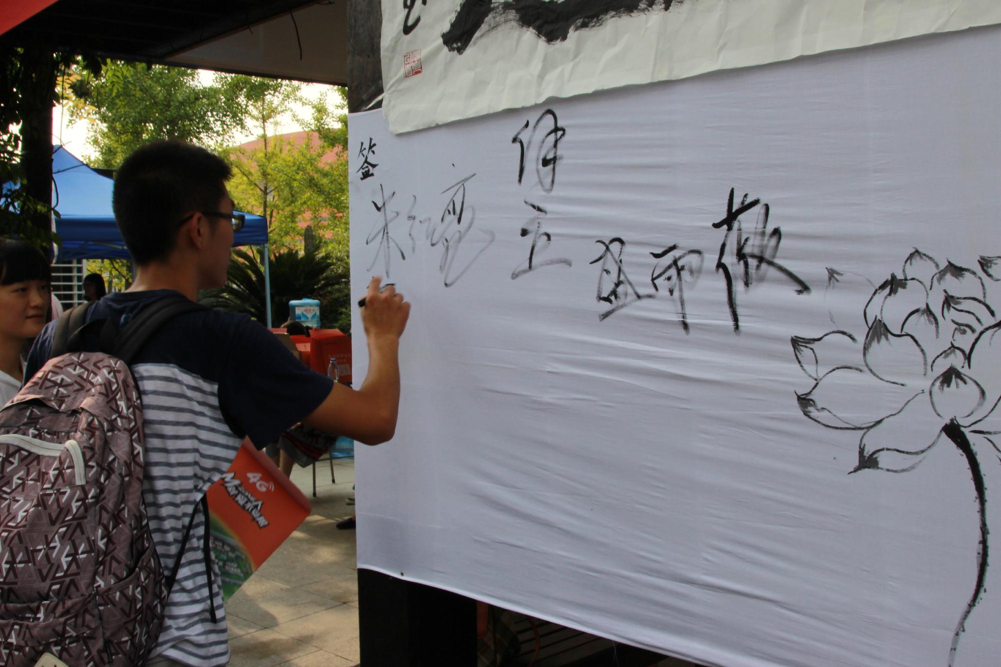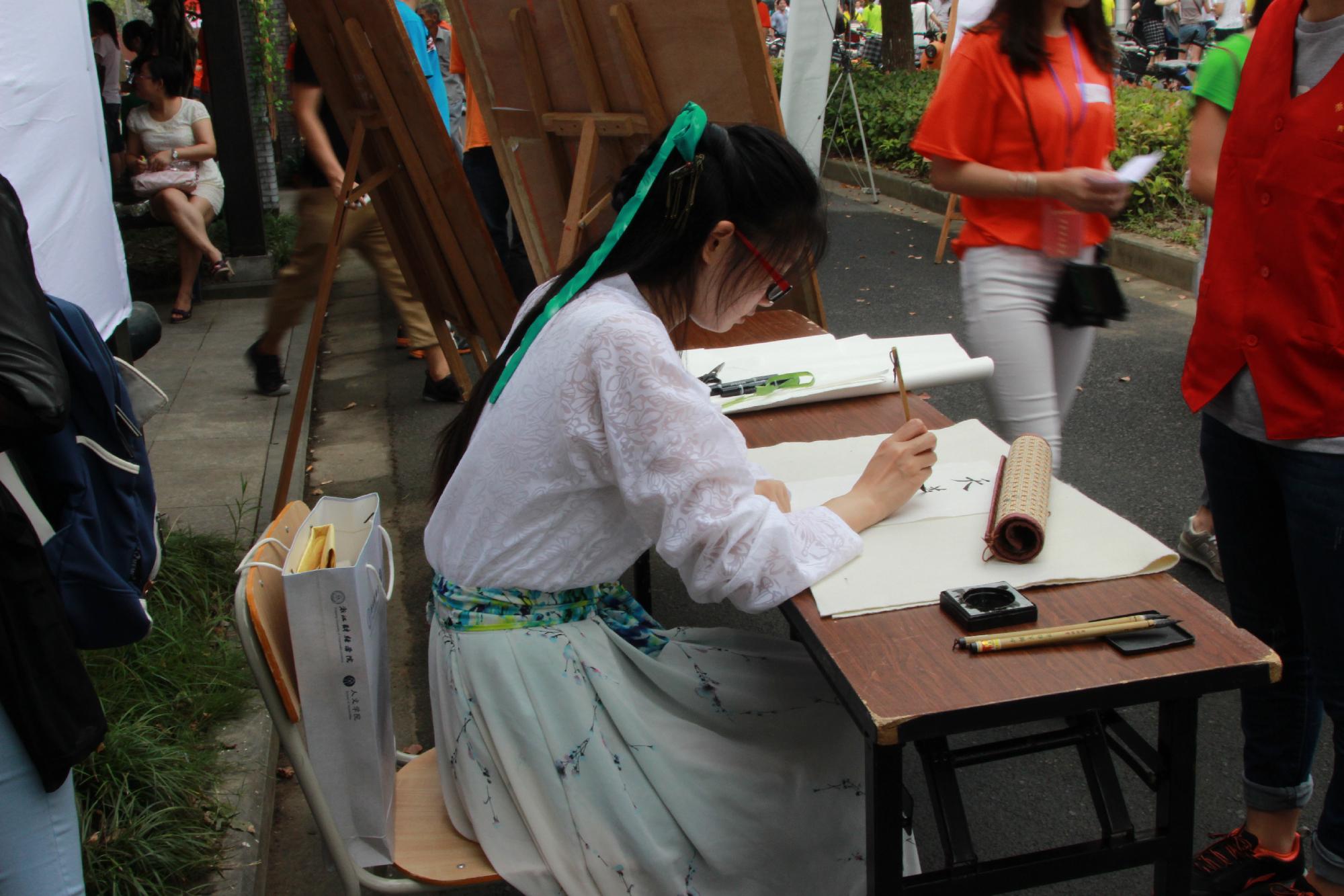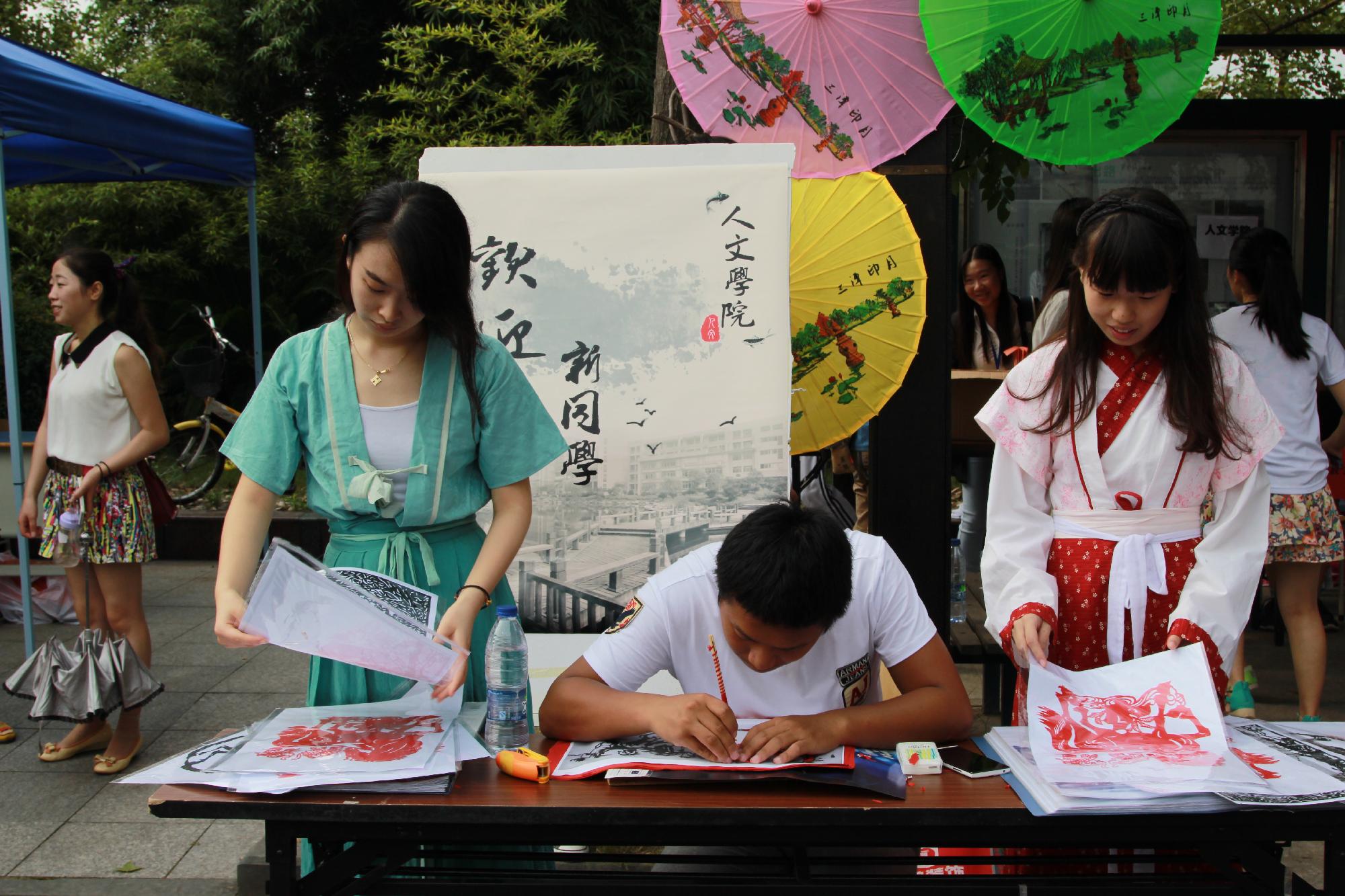 值得一提的是,较往年来说,今年学院将汉服、剪纸、书法等体现中国传统文化元素的内容融入到迎新工作中,使新生一入校就受到中国传统文化的熏陶。迎新点两侧用画有三潭印月、西湖等美景的各色油纸伞进行装饰;正中央悬挂了一幅提名为“奋进”的书法作品,还附有一个新生签名墙;各专业助班穿上汉服来迎接新生;现场老生们还准备了书法和纸上篆刻表演,他们将作品赠送给各位家长、老师还有新生们,赢得了大家的喝彩。14级文学班的助班罗婷同学说:“人文学院,顾名思义就是充满文化气息和文化气质的学院,而汉服具有深远的历史和深厚的文化底蕴,这最能代表我们学院的这种独有的气息和气质,所以我们就应该好好把它表现出来。”