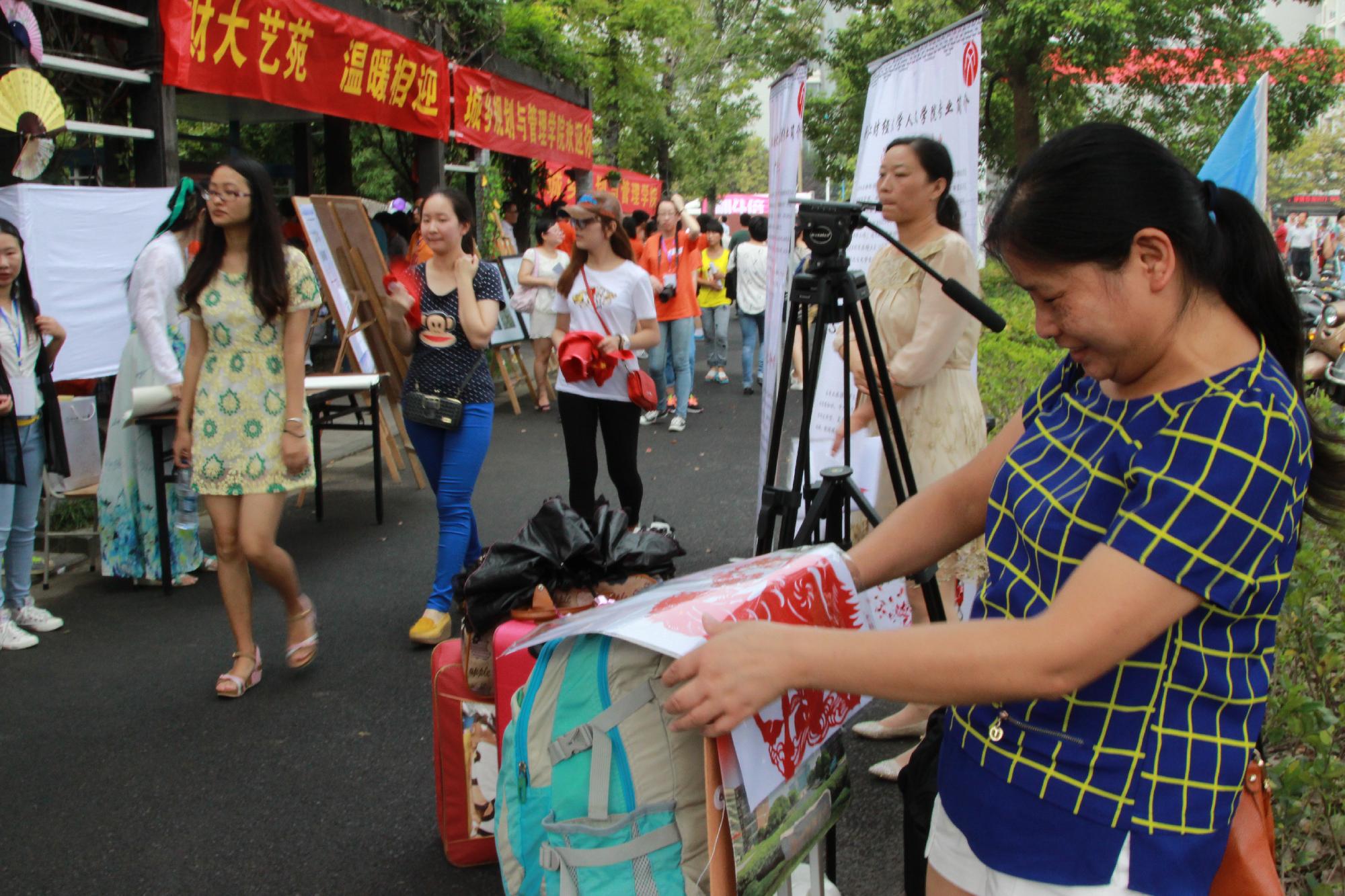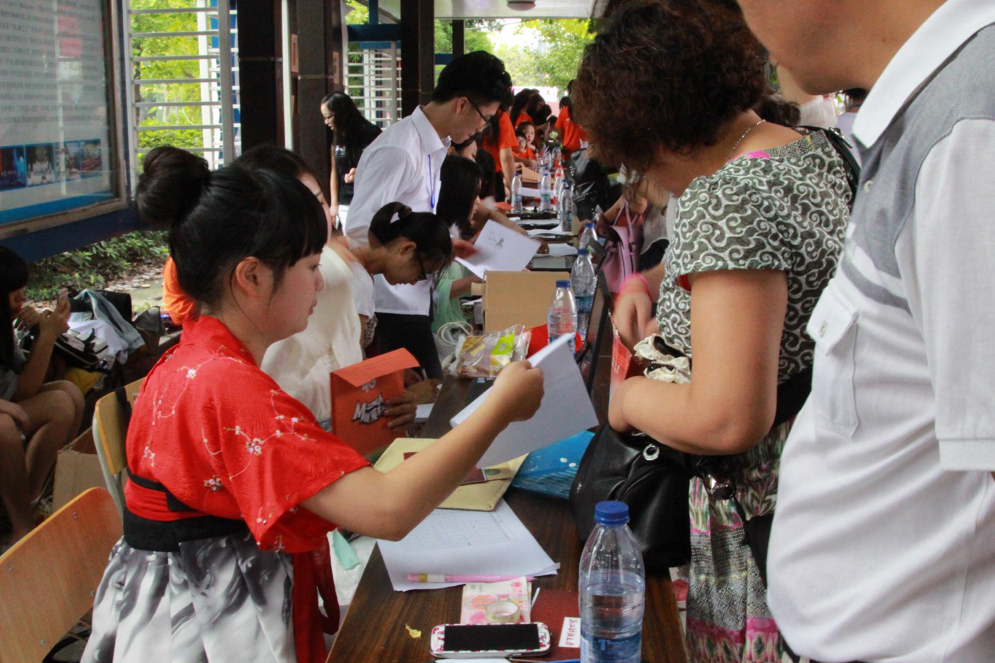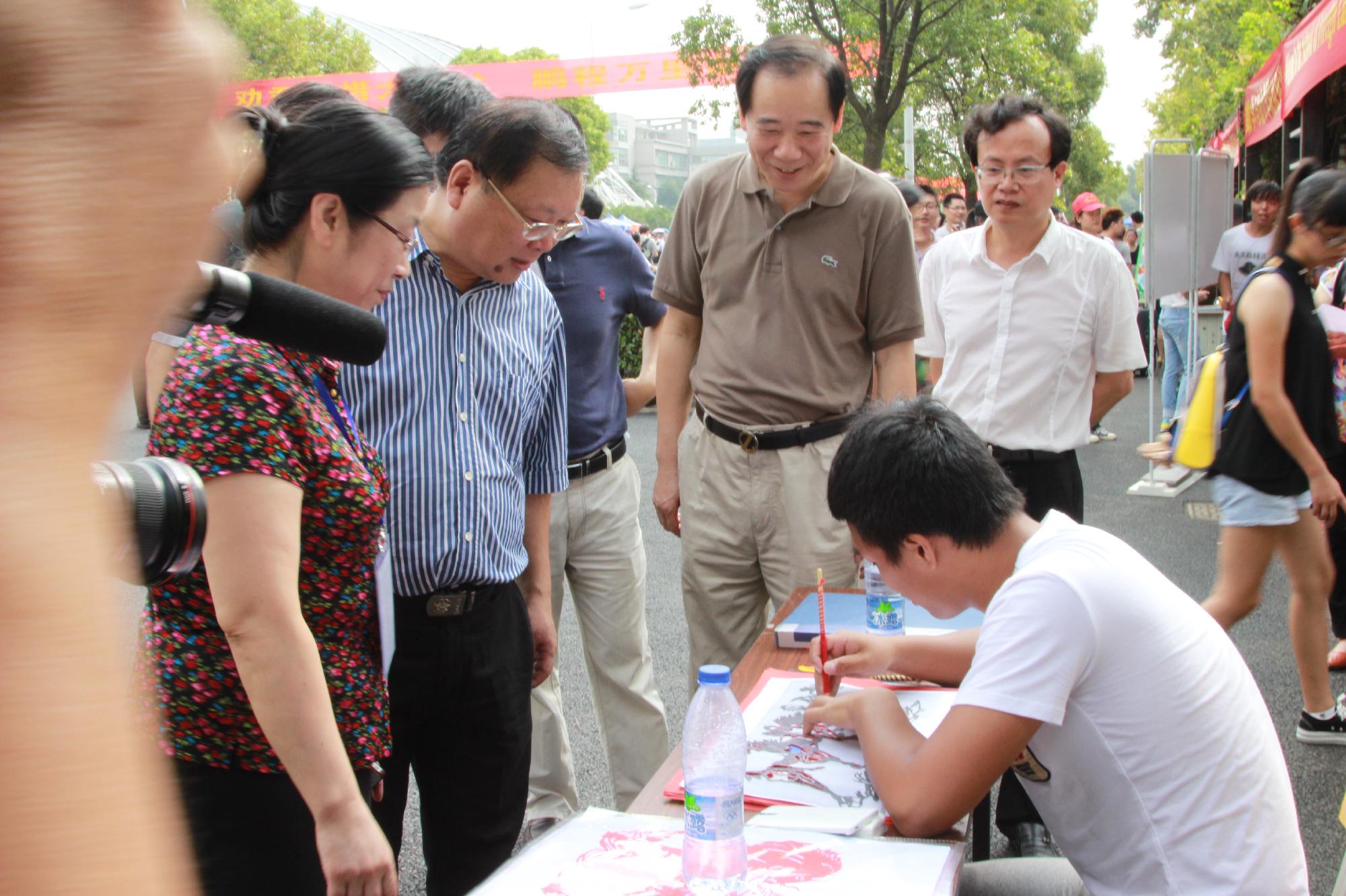 值得一提的是,较往年来说,今年学院将汉服、剪纸、书法等体现中国传统文化元素的内容融入到迎新工作中,使新生一入校就受到中国传统文化的熏陶。迎新点两侧用画有三潭印月、西湖等美景的各色油纸伞进行装饰;正中央悬挂了一幅提名为“奋进”的书法作品,还附有一个新生签名墙;各专业助班穿上汉服来迎接新生;现场老生们还准备了书法和纸上篆刻表演,他们将作品赠送给各位家长、老师还有新生们,赢得了大家的喝彩。14级文学班的助班罗婷同学说:“人文学院,顾名思义就是充满文化气息和文化气质的学院,而汉服具有深远的历史和深厚的文化底蕴,这最能代表我们学院的这种独有的气息和气质,所以我们就应该好好把它表现出来。”