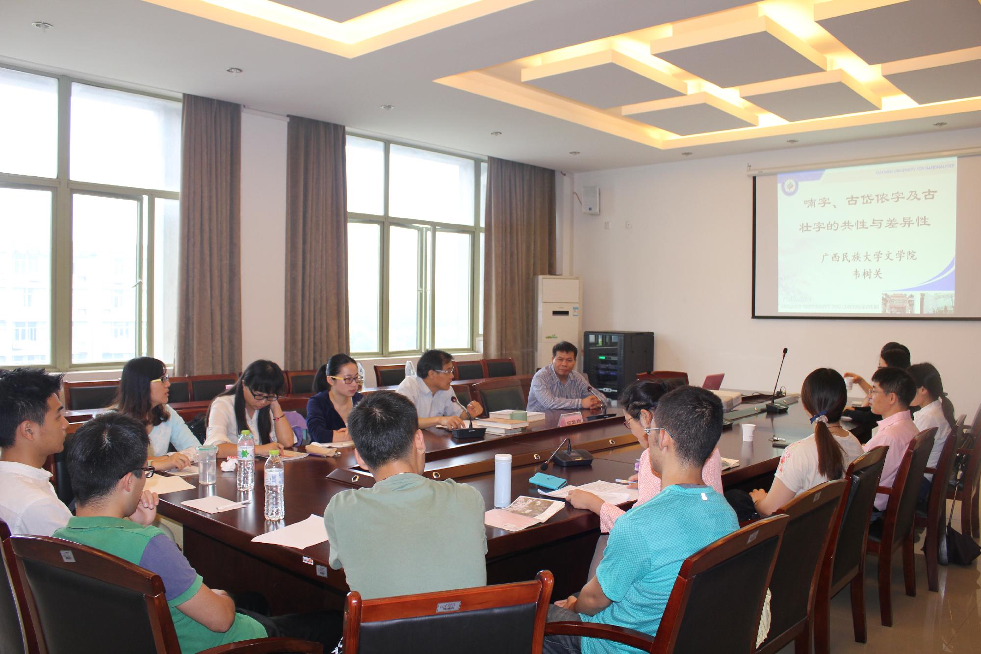 韦树关教授从喃字、岱喃字、古壮字三者的概念入手,深入浅出地阐释了三者之间的共性与差异性,并深入分析了产生共性与差异性的各种因素。在整个报告过程中,在座师生积极发言,与韦教授热烈讨论。整个报告现场热烈、气氛友好。
