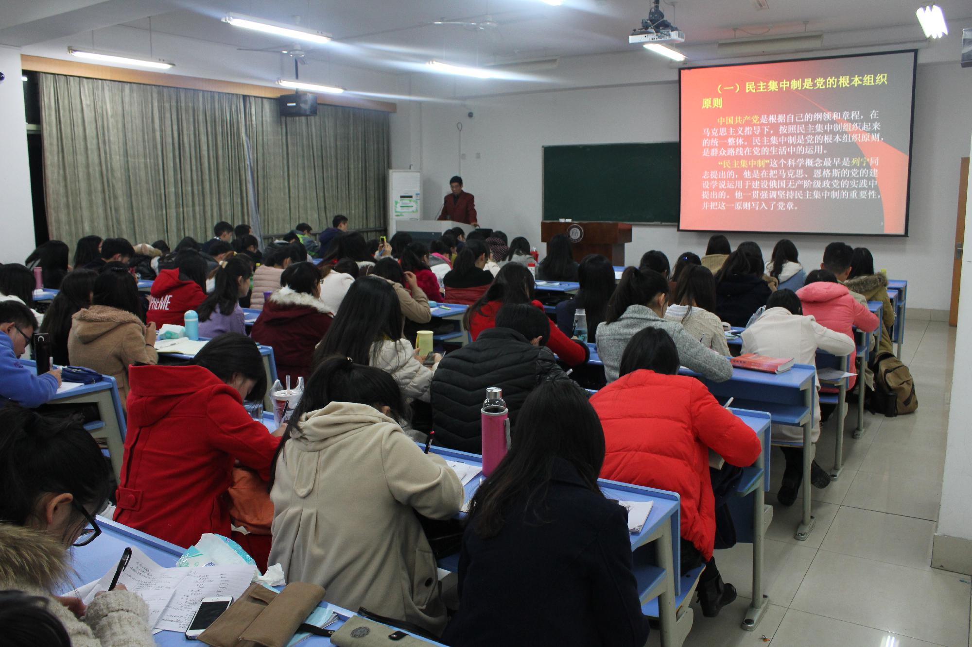 邀请了校内外五名主讲老师,他们围绕了多个角度、多个主题进行全方位授课。12月6日下午,首先,来自思政部的总支副书记何历宇老师,结合了习近平总书记的讲话内容,围绕“坚持中国特色社会主义道路”的主题,用GDP等各种数值对比了中国与多个国家的经济发展差别,从而了解到我国经济发展的优点和缺点在哪些方面。接着,校党委组织部副部长范建峰老师向大家阐明了“党员的权利、义务和共产党员的修养问题”,并且讲述当今中国的社会现状、改革开放取得的成就与毛泽东思想之间的关系、为何社会主义是中国的必由之路以及面对改革开放如何看待传统文化,金融学院党总支杨鹰彪书记结合中纪委近年来的惩腐规划以及国际组织发布的清廉指数为大家讲述“党的组织原则、党的纪律以及党风建设”三方面内容。12月9日下午,成人在线