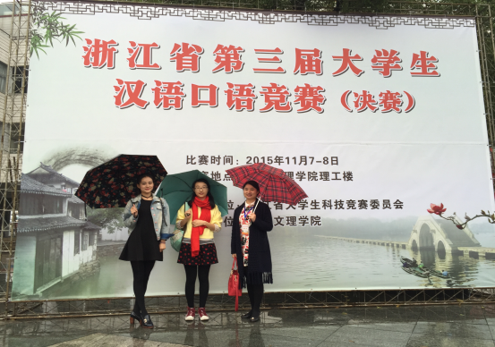 王怀榕老师带队的我校选手,参加了在绍兴文理学院举办的浙江省第三届大学生汉语口语竞赛,取得了可喜的成绩。来自会计学院的徐清怡、高雪莹、张振宇分别获得学生本科组一等奖、二等奖、三等奖,法学院的童韬羽获得学生本科组三等奖;成人在线