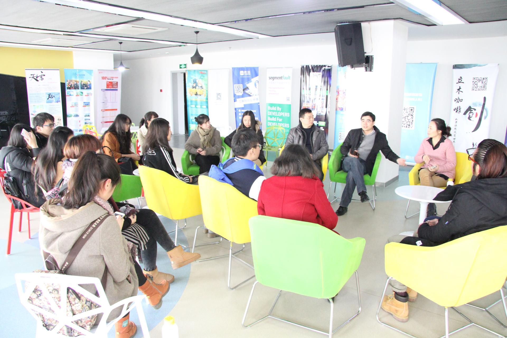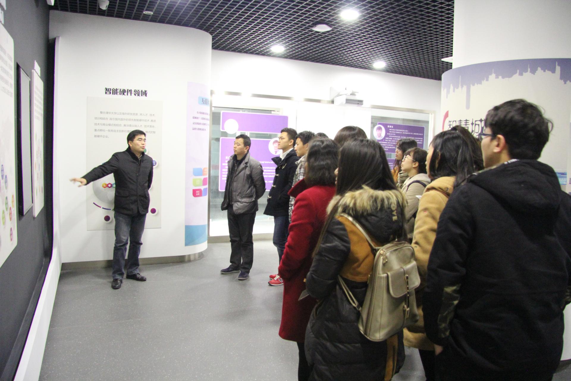 浙江清华长三角研究院杭州分院科技创新部副部长吴谦带领大家参观了研究院展厅,向我们介绍了整个分院的建设情况及创业项目,特别是他们目前重点发展的五个领域:大数据领域、电子商务领域、移动互联网领域、智能硬件领域,以及生命健康领域等。他又带领大家参观了正在孵化的企业、公司以及创客空间,大家近距离地与这些年青的创业者们进行了交流,同时也真实感受了一把创业的氛围。最后一站是带我们来到了浙江乾华泰豪文化创意股份有限公司,副总经理古国珍带领大家参观了企业,向大家介绍了企业对人才的需求及创业当中需要注意的事项,同学们深受启发。