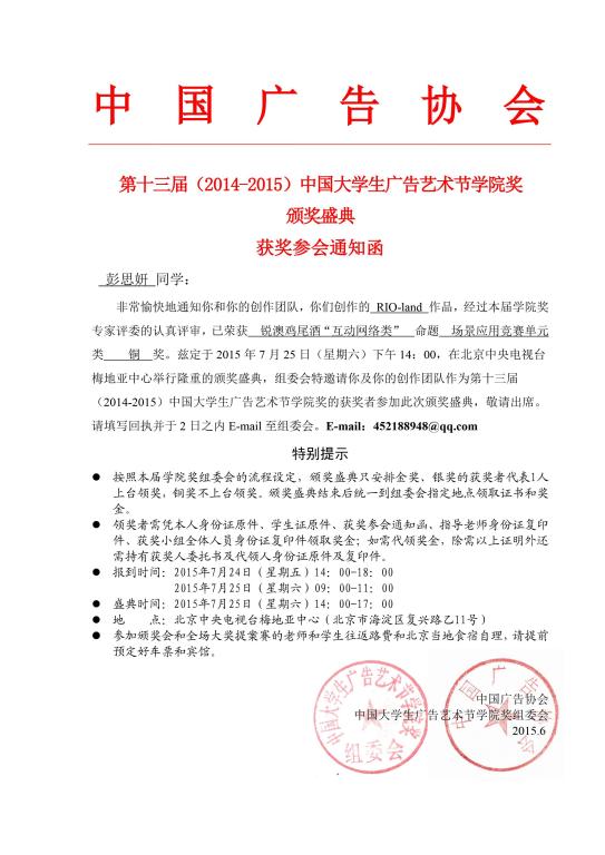 近期,由我学院教师董建华指导,广告学专业12级学生彭思妍创作的h5页面《RIO-land》荣获锐澳鸡尾酒“互动网络类”命题场景应用竞赛单元类铜奖。