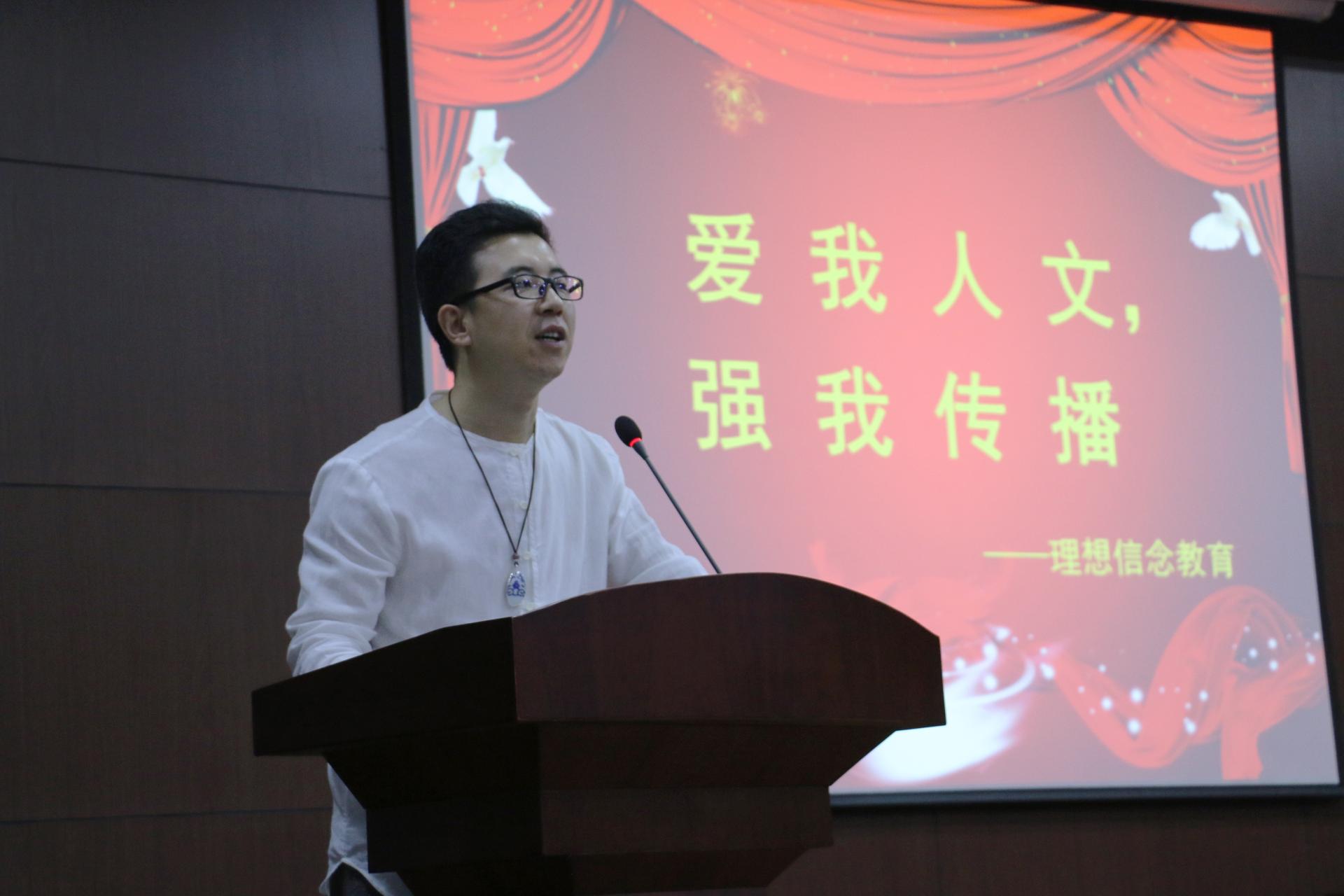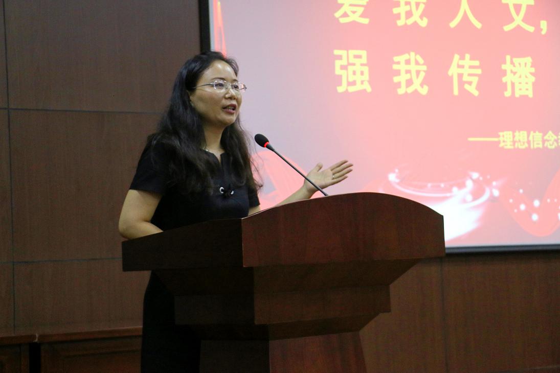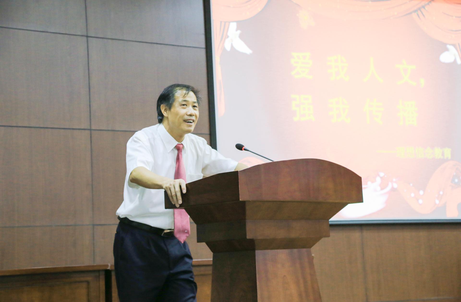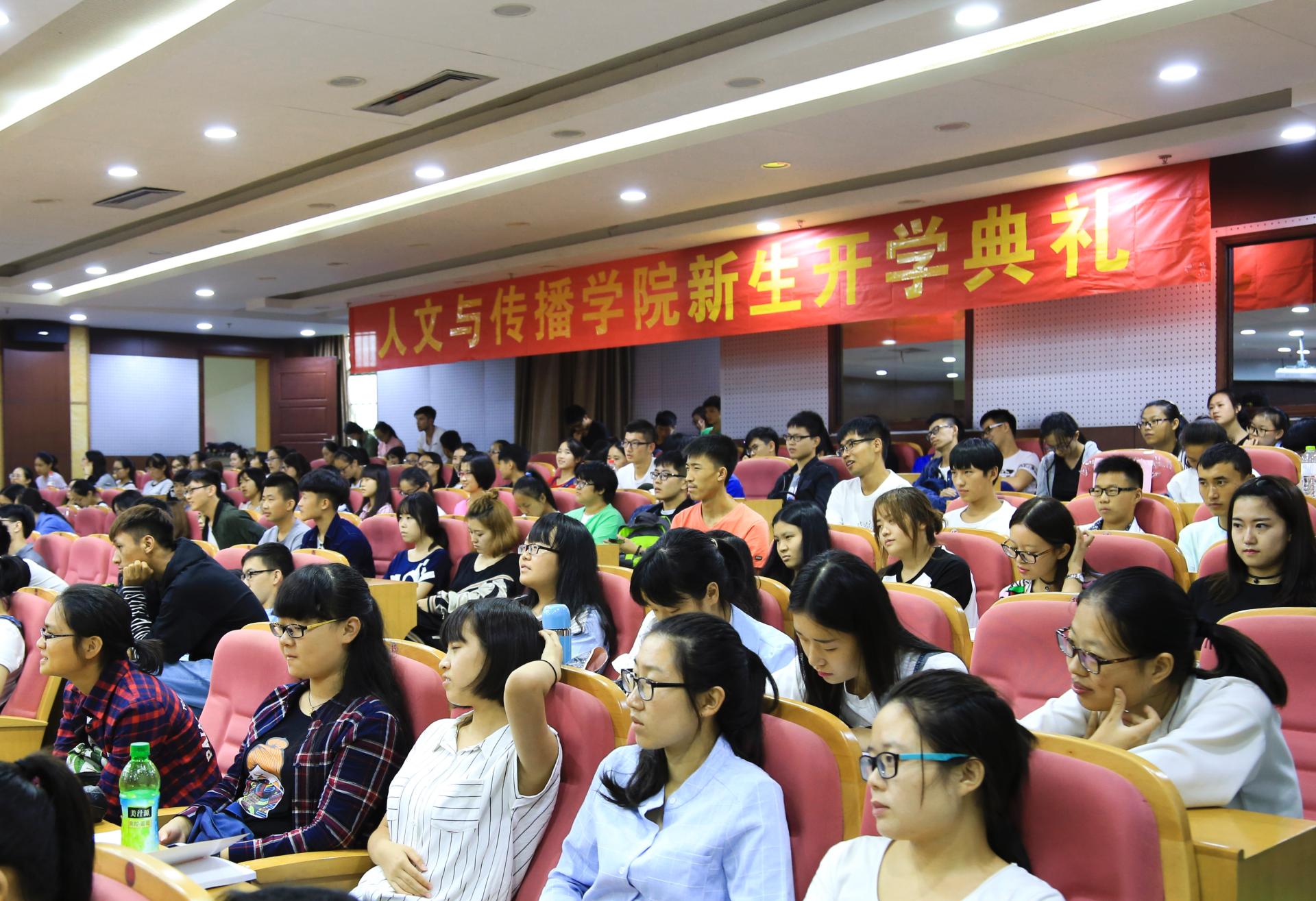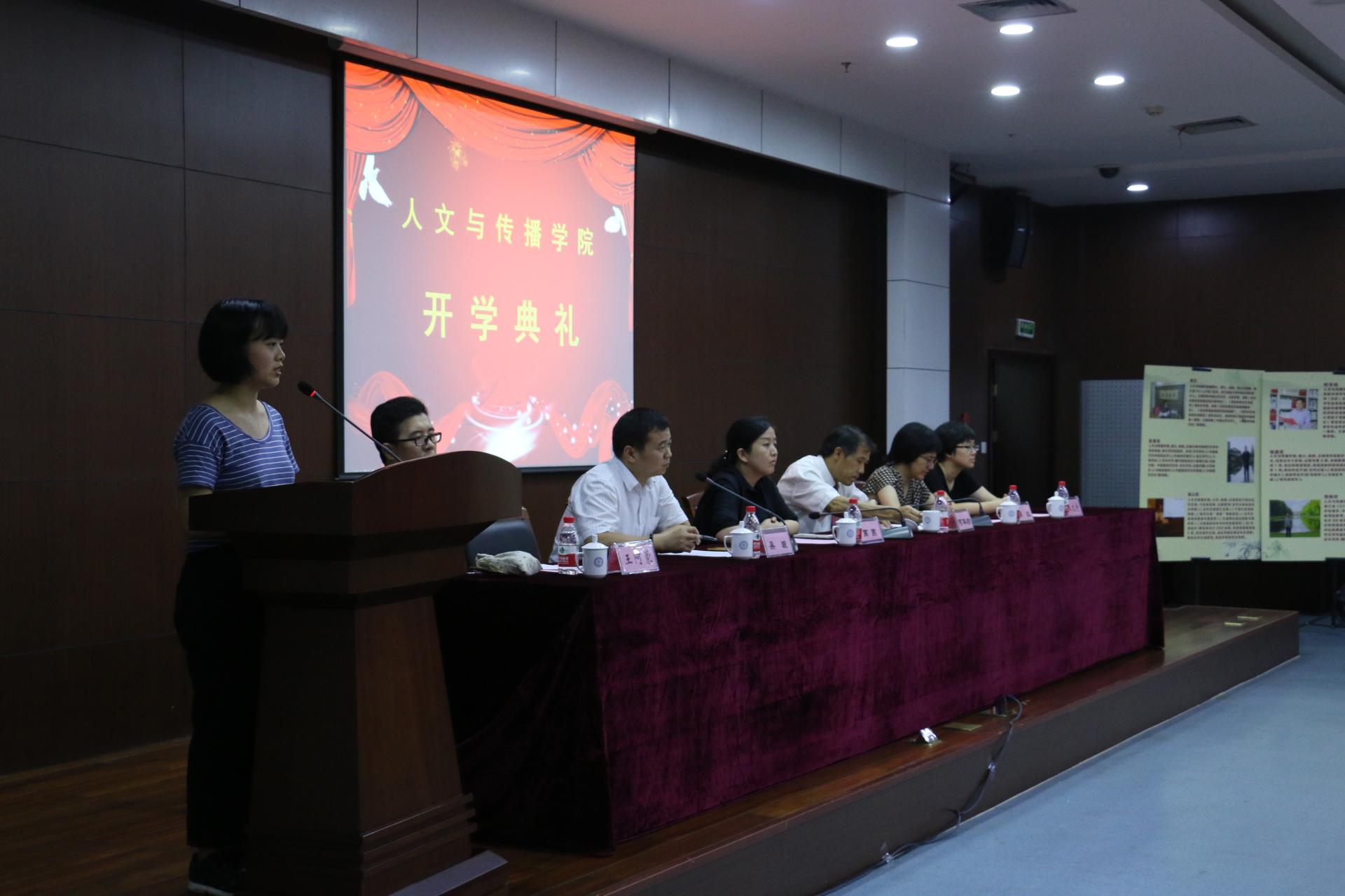 本次开学典礼分成两个部分举行,第一部分以学生为主,第二部分由院长何华珍老师与吴智斌、刘亚辉、陈静、王阿蒙和姚晓萍等5位教师一起给学生做以“爱我人文,强我传播”为主题的理想信念教育。