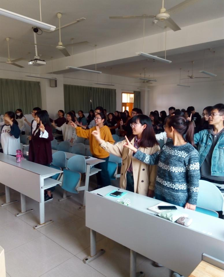 原来校红叶戏曲社的小伙伴,事先与任课教师一起作出“越剧进课堂”与教改实践相结合的创意,派出最强阵容,直接参与了戏剧课堂的教学。上课伊始,《梅龙镇·初遇》、《追鱼·张郎你听我从实讲》等精彩选段表演,立刻吸引了同学。随后越剧唱腔的练习,《红楼梦》宝黛初见时的“天上掉下个林妹妹”唱段,更让同学零距离接触越剧的魅力。大学校园上百人的越剧大合唱,实属少见。“娴静犹如花照水”,“娴”发yan的音,“如”发为ri,“水”发为sui。当说到,“越剧里面的念白是没有翘舌音的哦!”多数来自江浙,普通话考级深受翘舌音苦虐的同学,发出会心一笑。大家像小孩子刚学说话,一字一字的学发音,时而互看一眼,忍俊不禁。学到“只道他腹内草莽人轻浮”这一句,“黛玉”还教大家怎样手捏兰花指,右手从上而下画一个圈,指向“宝玉”。有同学还举手提问,“黛玉”唱的时候,不唱的“宝玉”该做些什么动作呢。
