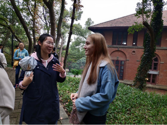 在沙龙举办之前,刘老师就让中国学生对浙大之江校区进行了解,并做了英文介绍的准备。在大巴车上,刘老师带领中外学生进行了简单的联谊活动,互相献歌一曲,并让中外学生互相介绍、交流。达到目的地后,两位老师带领大家观赏了浙大之江校区美丽的近代建筑群,包括钟楼、主楼、小礼堂、具有古罗马建筑痕迹的上红房、司徒雷登曾居住过的下红房等。刘老师向学生们介绍了每一栋等建筑的“前世今生”,使同学们对这所有着深厚民国气息的学校有了更为深刻的认识。中外学生也在“杭州最美校园”中进行了顺畅的交流。