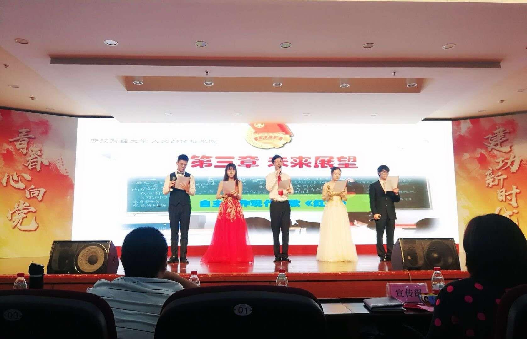 该团支部着力打造班级团支部“五彩”文化,不断推陈出新,向现场评委和观众展示了团支部“红岩读书”、“金色历史”、”青听之声”、”蓝色志愿”、”紫色团建”五大特色活动。现场,郭继、陆郡益、姚诗琪、林鹏伟、胡恩润五名同学朗诵了团支部创作的诗歌《红船》,结合学院特色,追溯红色轨迹,展现了成人在线 青年积极向上的风采面貌和团支部建设的优秀成果。