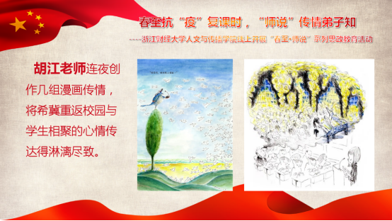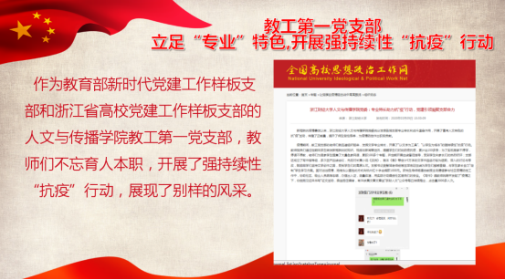 党委充分发挥各党支部专业特长和战斗堡垒作用,号召师生党员积极投身抗“疫”斗争,先后涌现出吴智斌、姚晓萍、杨建忠、何冬学、陈金柱等优秀师生党员典型。同时,各党支部利用专业特长,开展了富有人文特色的抗“疫”活动和教育实践,传播了正能量,提升了师生党性修养,为疫情防控作出积极贡献,相关事迹先后受到高校思政网、新浪网、浙江新闻网、浙青网、成人在线