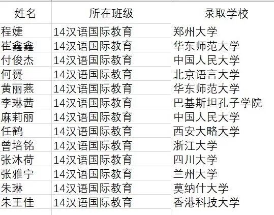 近几年来,汉语国际教育专业就业呈现高数量、高质量的特点,一次就业率均高于94%,年终就业率为100%,且就业质量较高,1/3学生考研或出国。多人在美国哥伦比亚大学、美国东北大学、美国罗格斯大学、加拿大西安大略大学、英国格拉斯哥大学、英国诺丁汉大学、英国莱斯特大学、法国雷恩高等商学院、法国IPAG高等商学院、澳大利亚莫纳什大学、澳大利亚墨尔本大学、香港城市大学、香港理工大学、复旦大学、北京语言大学、华中师范大学、西南政法大学等高校进一步深造。