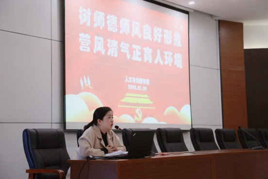 开展师德专题教育实施方案》《新时代高校教师职业行为十项准则》等文件,并进行案例警示教育。要求全体教师要努力提升自身道德素质,坚守正确的政治方向,爱国守法潜心育人。建立良好的师生关系,用榜样力量和人格魅力感染、感召、影响学生,真正把教书育人和自我修养结合起来,维护良好的教师职业形象,以德立身、以德立学、以德施教。会议还强调疫情防控工作及学院发展及安全稳定等相关事宜。会上签署了《师德师风承诺书》、《教学科研人员廉洁从教从研承诺书》。