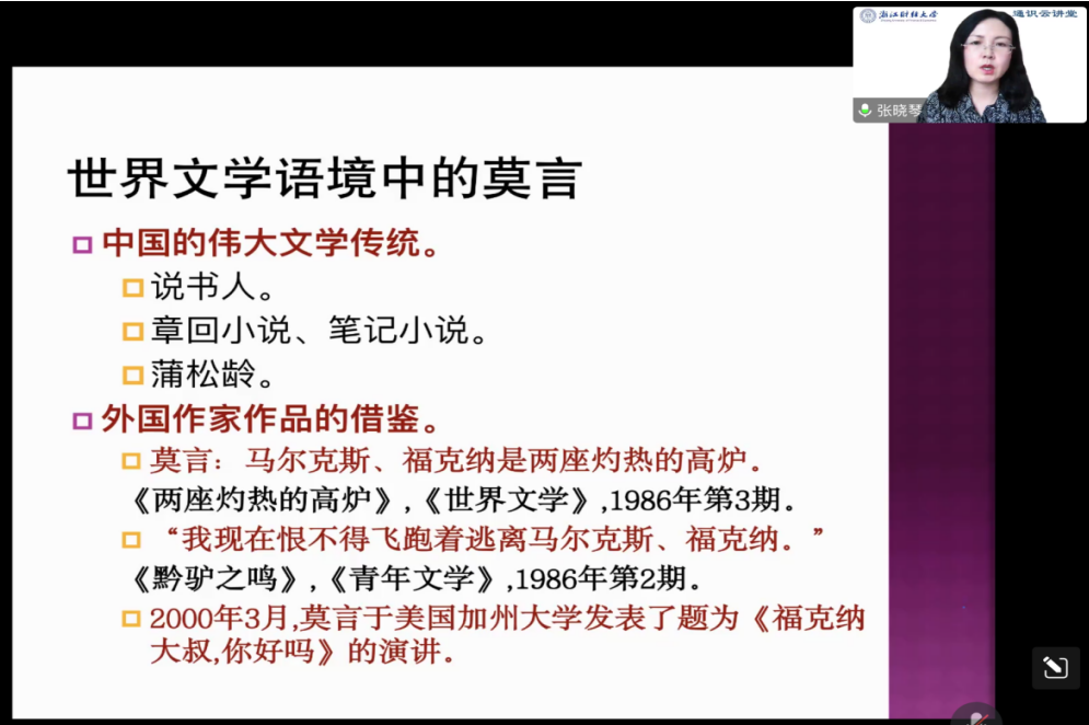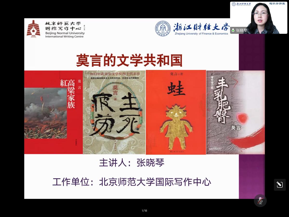 师生举办了一场题为《莫言的“文学共和国”》的学术讲座,全方位、多维度给我们展示了中国惟一诺贝尔文学奖得主莫言的“文学共和国”。讲座由吴智斌老师主持,近900名我校师生通过腾讯视频会议、钉钉群收看了讲座。
