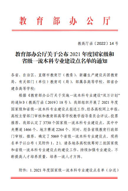 近日,根据《教育部办公厅关于公布2021年度国家级和省级一流本科专业建设点名单的通知》(教高厅函〔2022〕14号),成人在线