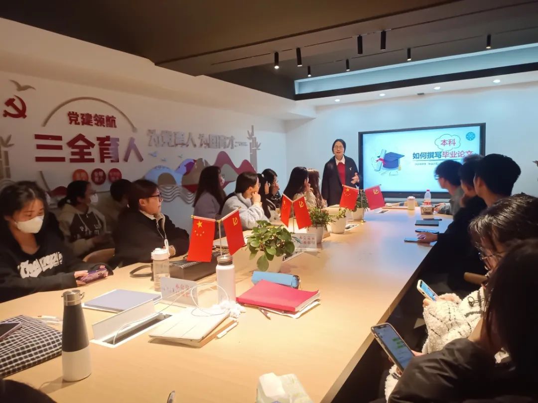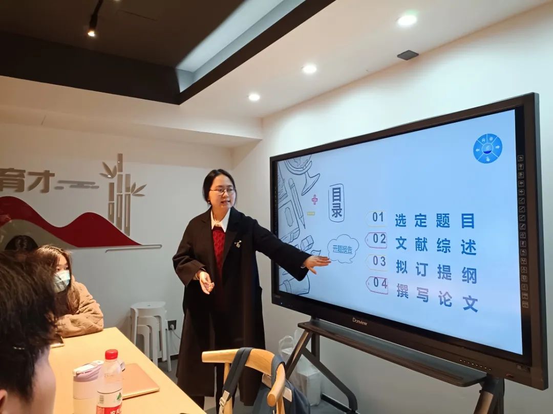 虞越溪老师作为本次活动的主讲,以“如何撰写毕业论文”为主题,从选定题目、拟定大纲到修改定稿,耐心详尽地教同学们怎样写好一篇本科毕业论文。辅导员马羚凯、顾雨濛以及22文学C3班全体同学参加了本次活动。