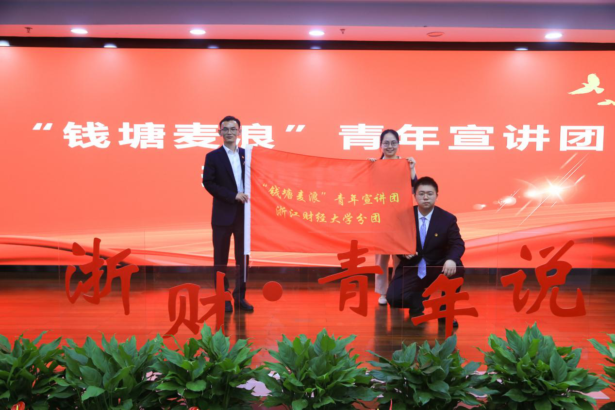 活动现场,陈州峰为宣讲团成员代表授旗,钱塘区“钱塘麦浪”青年宣讲团成人在线