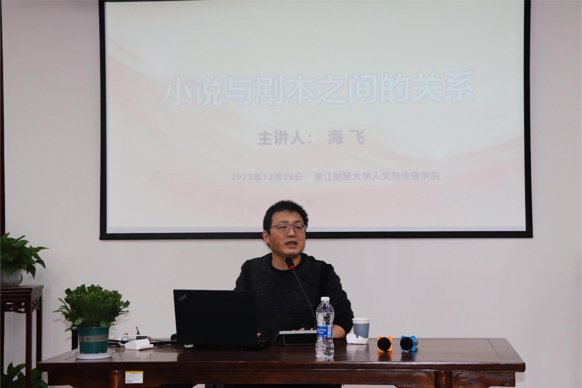 “小说与剧本又是相反的关系,尤其是在思维方式上。”在阐述了小说与剧本之间的相互联系后,海飞老师又从小说与剧本之间的异质性展开讲述。海飞老师着重要区分小说与网络小说、作家与编剧的概念。结合对《八角笼中》等影视剧的分析,他进而指出小说是留白的艺术,而影视剧本的大众面向要求编剧具有商业思维,更讲求剧本情节的此起彼伏。