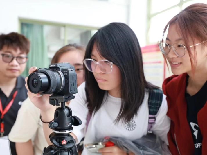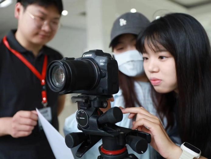 能够继续依托“数智杭州”的产业优势,在数字经济、融媒体、智能传播、新电商等领域发挥学术研究、教学实践的创新引领优势。(下图为会场外体验区同学们认真实操高精数字影像设备。)