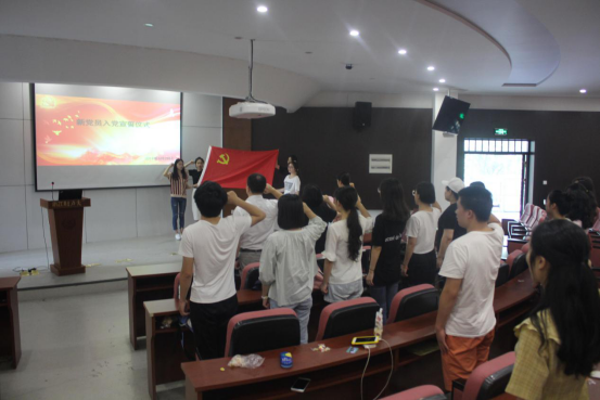 活动现场,全体师生党员重温誓词。在领誓人李洁老师的带领下,全体与会党员,面向党旗,紧握右拳,以高亢、饱满的声音向庄严宣誓。激昂的宣誓响声响彻会场,令人精神振奋、心潮澎湃。