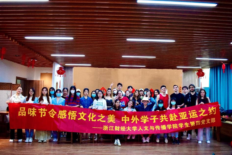 学生第四党支部联合国际学院党支部开展“品味节令感悟文化之美·中外学子共赴亚运之约”党建品牌立项活动。我支部全体成员和来自俄罗斯、赞比亚、哈萨克斯坦、乌兹别克斯坦等二十余名国际学院留学生共同参加本次活动。本次交流活动旨在以立夏这一节令为契机,通过介绍二十四节气相关知识增强留学生对中国节令文化的认识及对中华传统文化的了解。