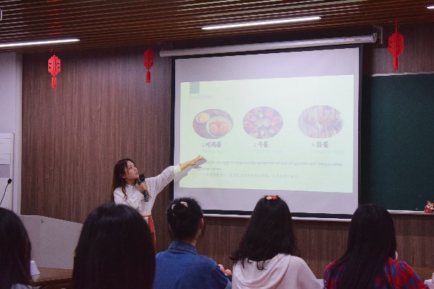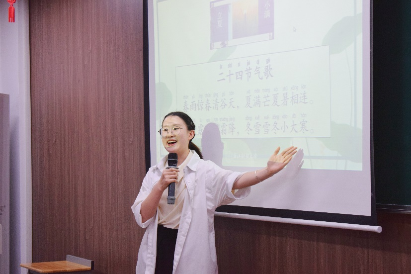 首先,国际学院留学生辅导员陈思涵老师对此次活动流程进行了简单介绍。随后,我支部汉语国际教育专业研究生赵优、夏瑞和刘春燕同学分别用中英文向中外学生简单介绍了二十四节气的由来、时间、三候及对应的饮食习俗,并带领中外学生一起吟咏二十四节气歌。