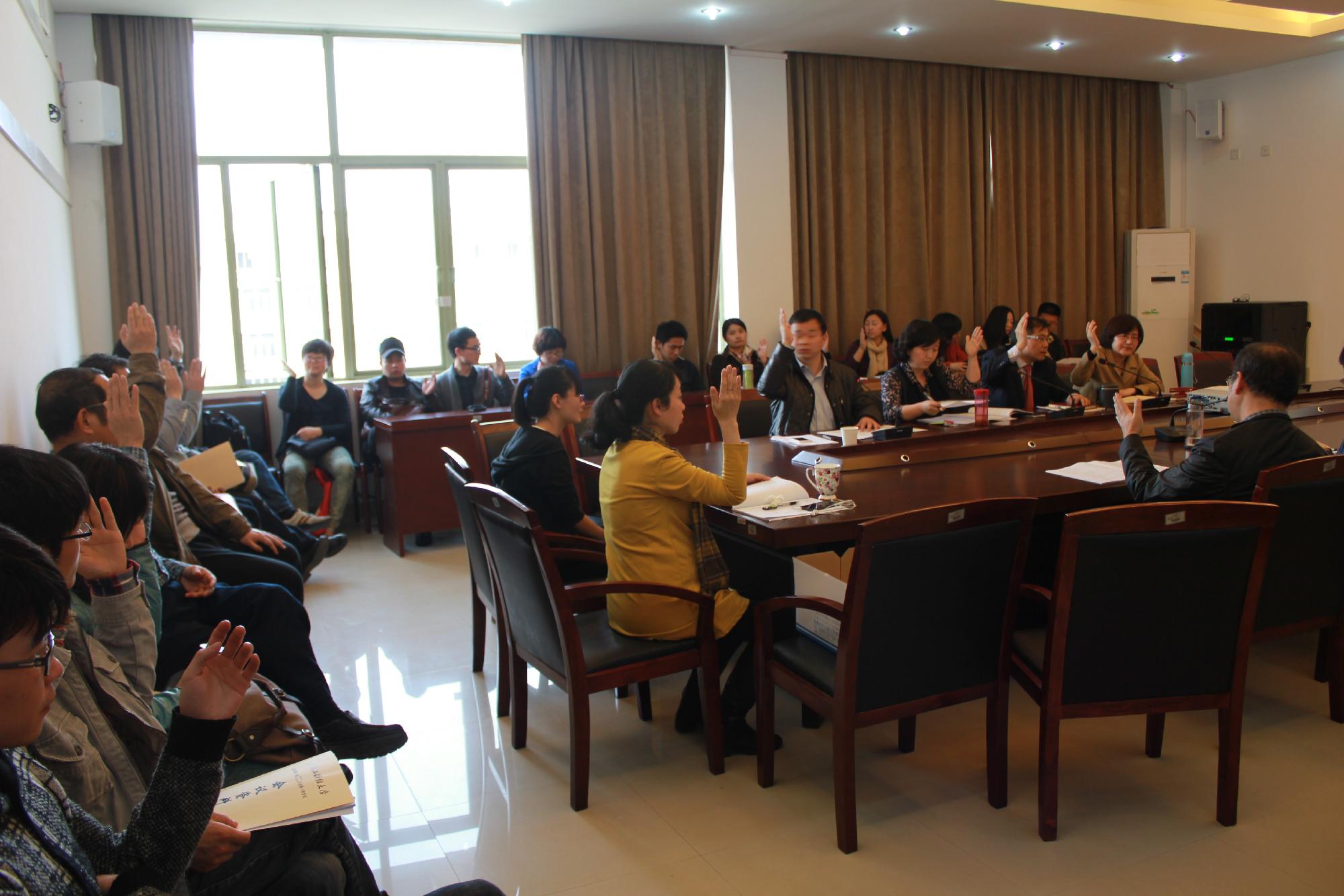 人文学院第一届教职工暨工会会员大会第一次会议在7号学院楼404会议室隆重举行,校工会副主席白羽、学院党政领导和全体教职工出席大会,会议由学院党总支副书记吴玻主持。