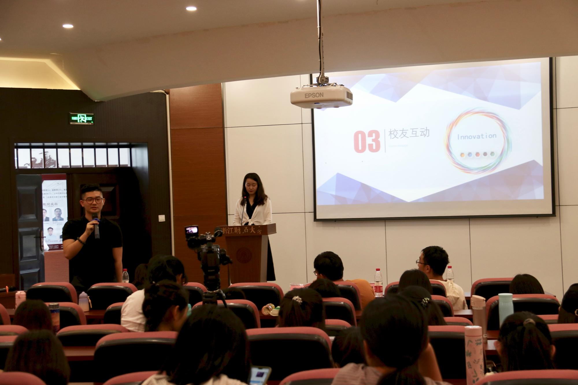 第二阶段,校友们纷纷与在校生分享了自己创业经历和创业故事。赵国强校友通过过讲述“做好两件事”“产品商业化”“合理分工”“定义成功”等七个主题向大家分享了他的创业感悟;张加林校友结合自身的创业经历和大学生活,声情并茂地对大家进行了创业经历;汤凯文校友从他的创业经历出发,分享了成人在线和企业定位,同时还强调了“合作”和“反思”在创业过程中的重要性;詹天卓校友风趣幽默地讲述了自己的从业和创业过程,向同学们强调了“做人”和“情商”在商场中的重要意义。在互动环节,同学们就大学阶段的专业学习对创业的影响,创业途径以及创业的生活节奏与校友们进行互动交流,四位校友结合自身经历,一一回答了同学们的提问。