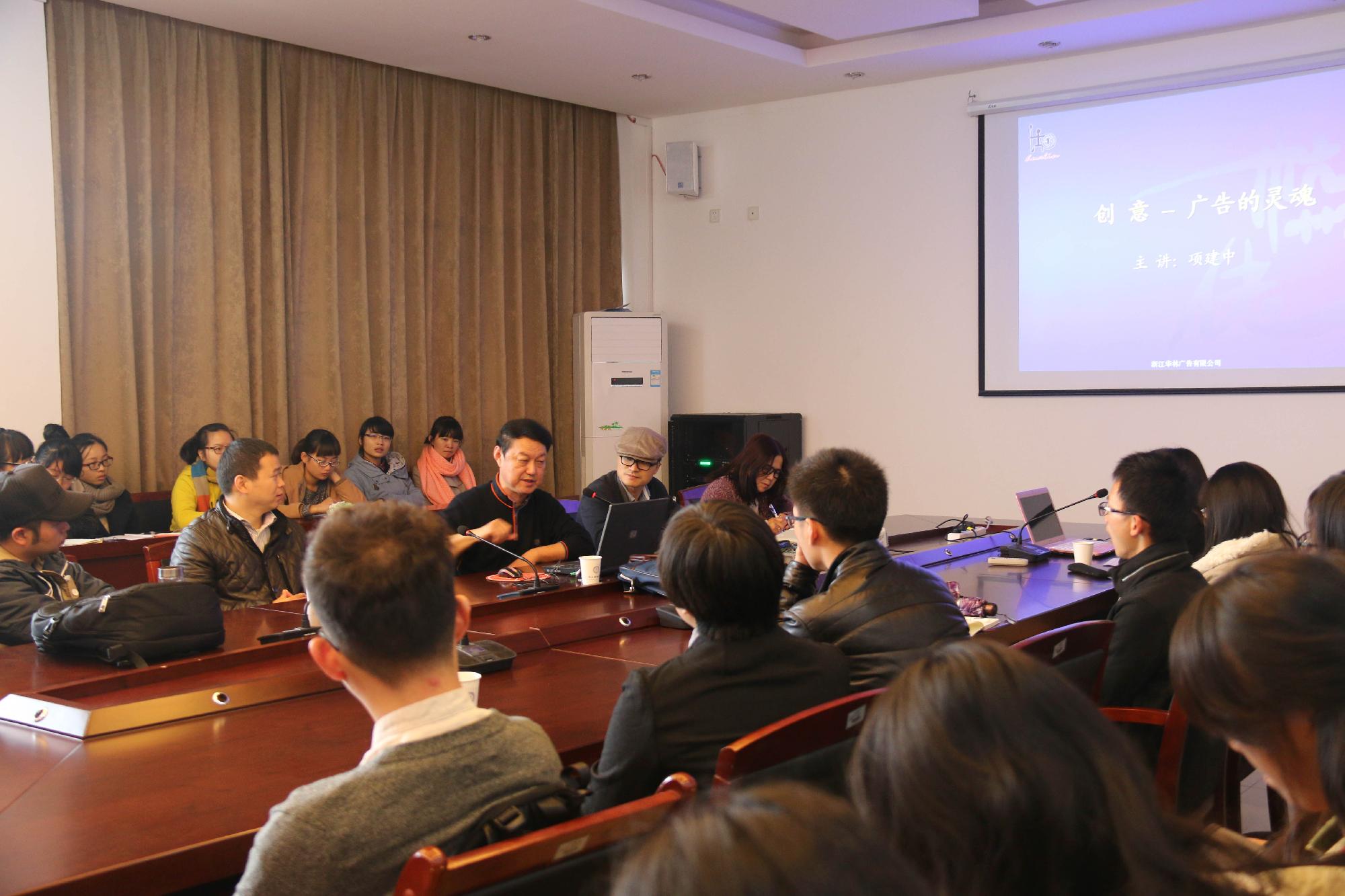 11月29日上午,一场题为“广告大赛创意谈”的讲座在学院楼404会议室召开,此次讲座由浙江华林广告有限公司的董事长兼导演、浙江工业大学之江学院教授、广告学科带头人项建中教授担任主讲,学院党总支副书记吴玻、广告学科专业教师及学生代表50多人参加了此次讲座。