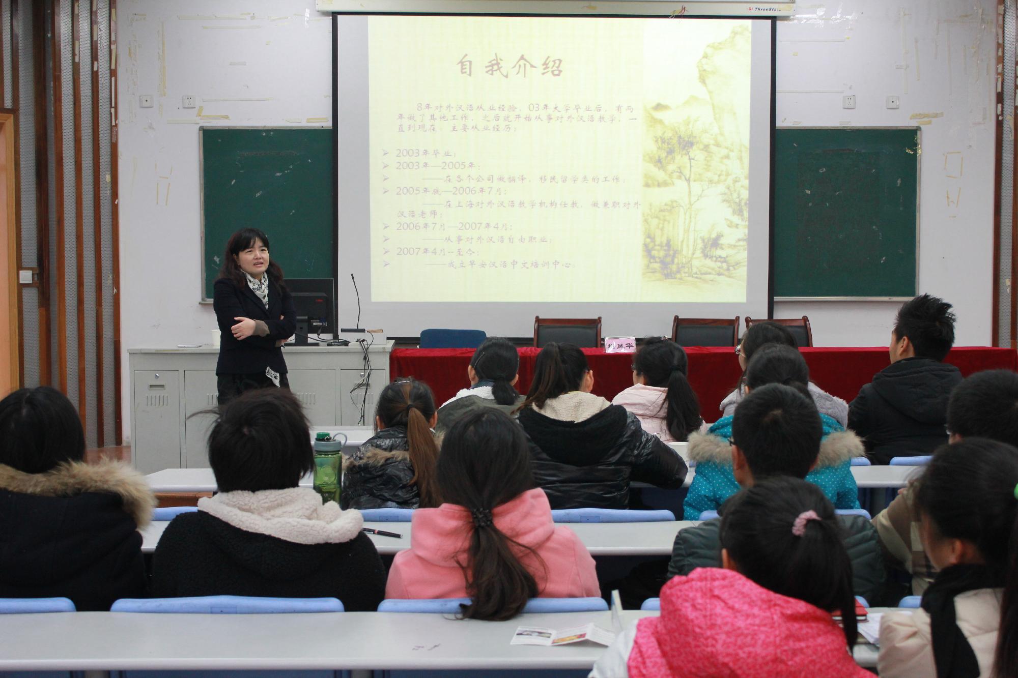 下午3点,上海早安汉语培训学校杨凤华校长为同学们作的讲座题为“汉语国际教育专业学生职业能力的培养”。杨凤华校长也是对外汉语专业毕业,她从一个学姐的角度,以自己在大学时的迷茫、刚毕业时的兼职、打拼,到白手起家成立早安汉语的经历告诉大家在学期间应该积累哪些方面的知识,培养哪些方面的能力。