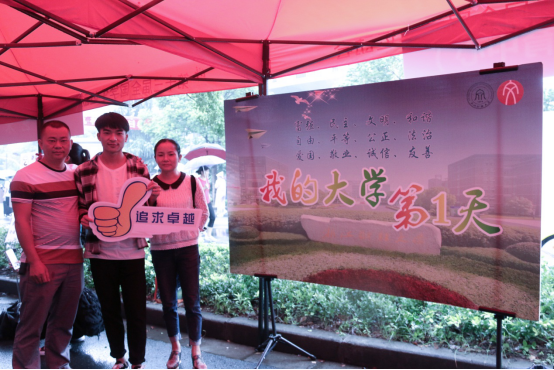 今年的迎新工作,学院提早规划、精心布置,学院学生会、2017级新生班助提前几天就在布置场地,策划活动,为新生准备具有意义的大学第一天。学院在报道现场布置了以“我的大学第一天”为背景的展板,并写上了社会主义核心价值观,制作了许多“不挂科”、“不旷课”、“自强不息、追求卓越”等标牌,供新生选择拍照留念。通过这种形式,让新生学习“社会主义核心价值观”,向学校承诺在以后的学习之中做到不旷课、不作弊、不挂科等,上好新生入学第一课。迎新现场还准备了具有中国传统文化特色的印章装饰置于报到处两侧柱子,彰显人文特色。迎新当天虽然下着雨,贴心的志愿者们还为新生及家长准备了一次性雨披以防有些前来报到的同学因为没有带伞而被淋湿。很多家长被这暖心之举所感动。