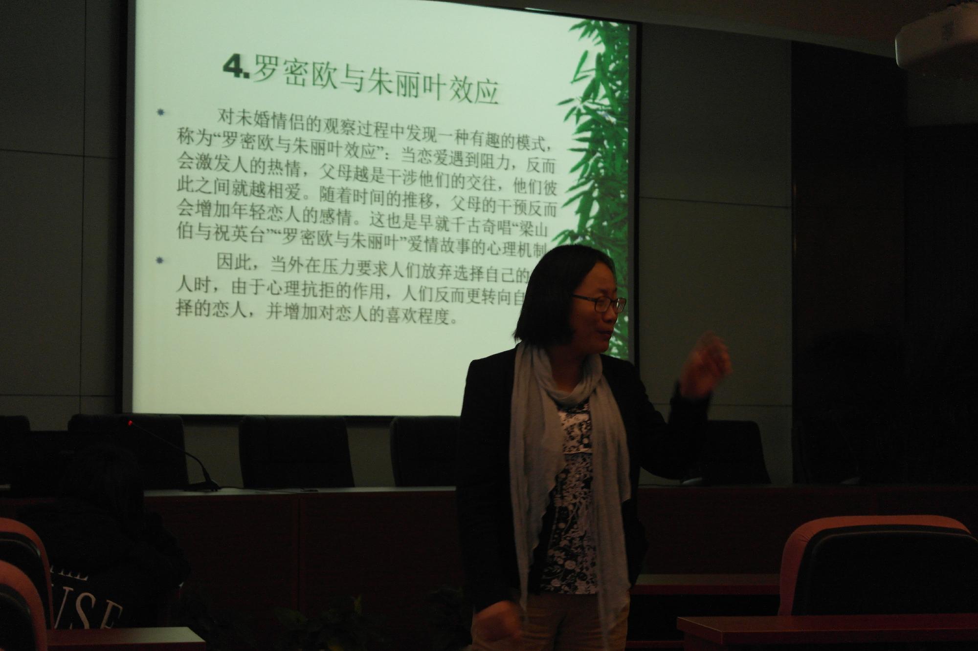 之后的三次团课分别由袁慧兰老师、吴翼泽老师以及章立峰老师主讲。袁慧兰老师主要从心理角度给14级新生讲述了大学生爱情方面的问题。她从恋爱心理效应、恋爱心理机制、恋爱的四个阶段以及恋爱心理任务四个大方面给大家上了一堂关于爱情的课程,通过举例向大家讲述什么是爱情,并鼓励大家及时失恋了也不要丧失爱的能量,且还精心准备了心理测试,让大家了解自己的恋爱心理成熟度,整个课程轻松愉悦,也给新生在爱情生活方面提供了很多建议。