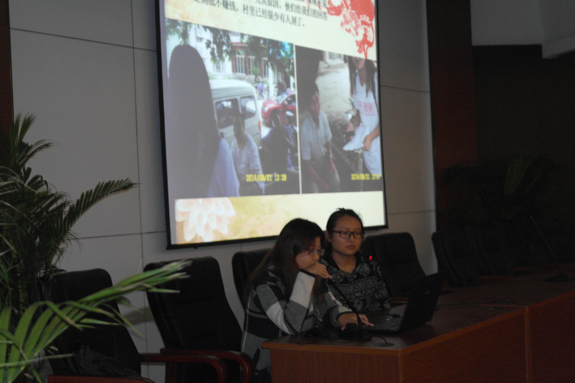首先是2014年暑期社会实践分享会,由12文学的罗婷、13广告的刘玲玲、13文学的吴巧玲以及14汉教的宋澔同学主讲。罗婷同学带我们领略了一番美妙的运河文化,刘玲玲同学就他们小组的活动给同学提供了很多想法和建议,吴巧玲同学就采访毕业校友得到的经验也和大家分享了一番,最后宋澔同学给大家展示了中国传统的刻纸艺术的分享,给大家带来了很多乐趣和很多经验建议。