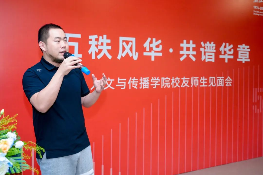 桃李不言,下自成蹊。03级广告学专业本科毕业生、07级汉语言文字学专业硕士研究生、嘉悦物产集团有限公司副总经理朱振伟受邀做分享。他表示对学院的发展建设深感震撼与骄傲,并向学院领导与老师们对学院建设作出的巨大努力表达了诚挚的感谢,对学院未来发展献上了真诚的祝福与期待。