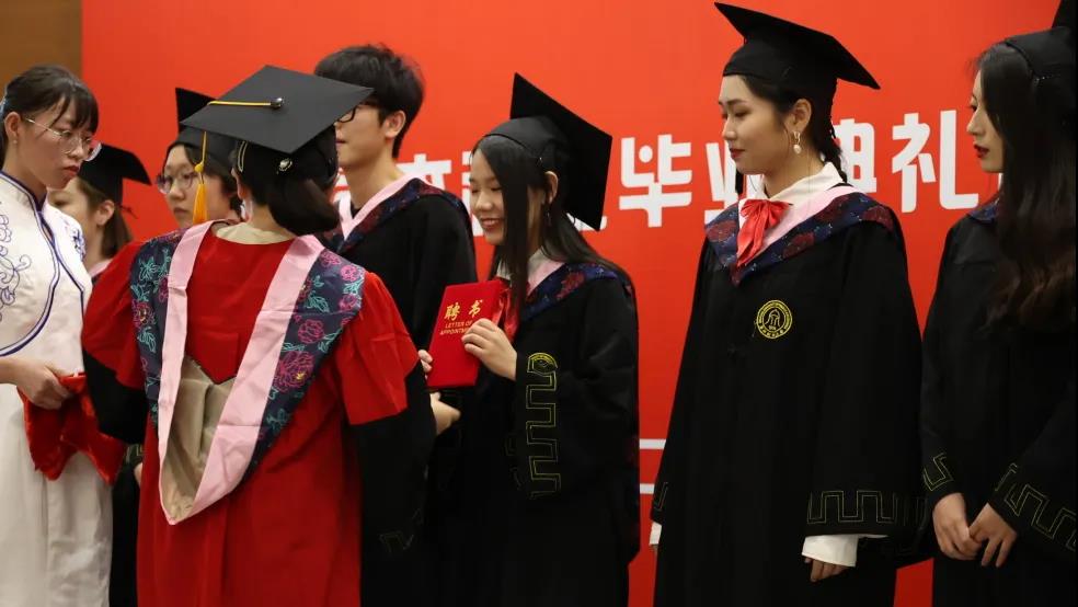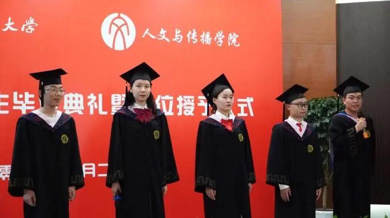 副校长徐晓东,人文学院院长周保欣、党委书记高燕、副院长陈静、院长助理吴智斌、中文系赵顺宏、国际汉语系杨建忠、广告系胡文财、网络与新媒体系洪艳等九位老师身着导师服上台,与受礼的毕业生依次握手,并为他们颁发学位证书和拨穗。四年上下求索,满获沉甸甸的知识,人文学子已如麦穗般成熟。将流苏从右拨至左这一个动作,将学子们的青葱岁月、求学生活悄悄翻过,他们的人生也从此进入了崭新的篇章。在仪式的最后,各位领导老师和全体毕业生们手执彩色纸飞机,在学涯湖畔,让梦想随着纸飞机飞向远方。