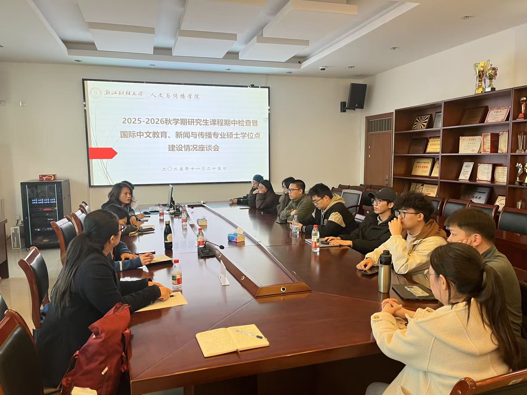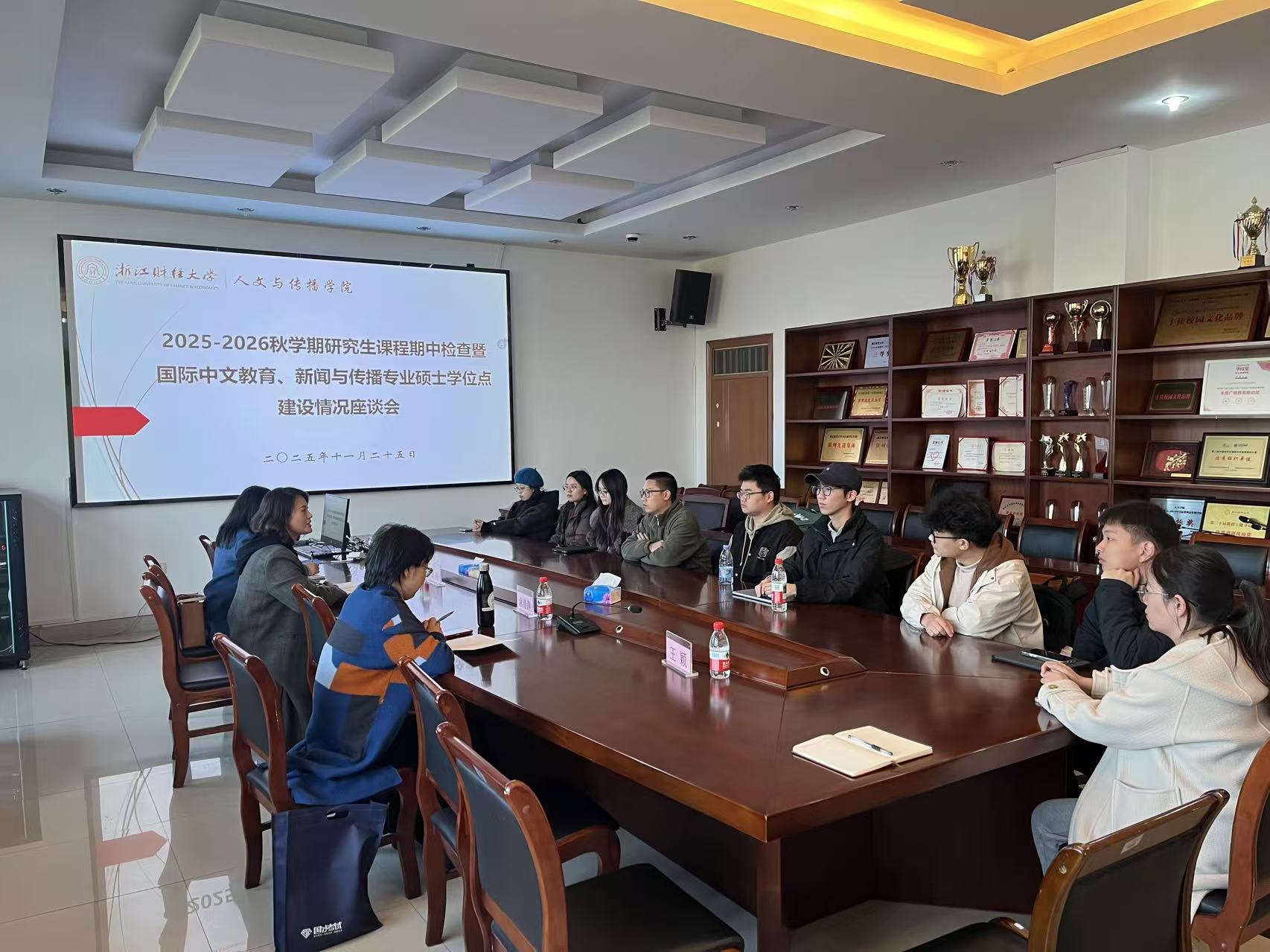 于11月25日下午16:00在学院楼404会议室召开本学期的研究生座谈会。本次座谈会邀请到了研究生院督导余清萍教授,学院分管领导毋丹副院长参加并主持本次座谈会,国际中文教育负责人付伊副教授、新闻与传播专业硕导王颖副教授、研究生秘书以及学院24、25级各专业研究生代表20余人参加了座谈会。